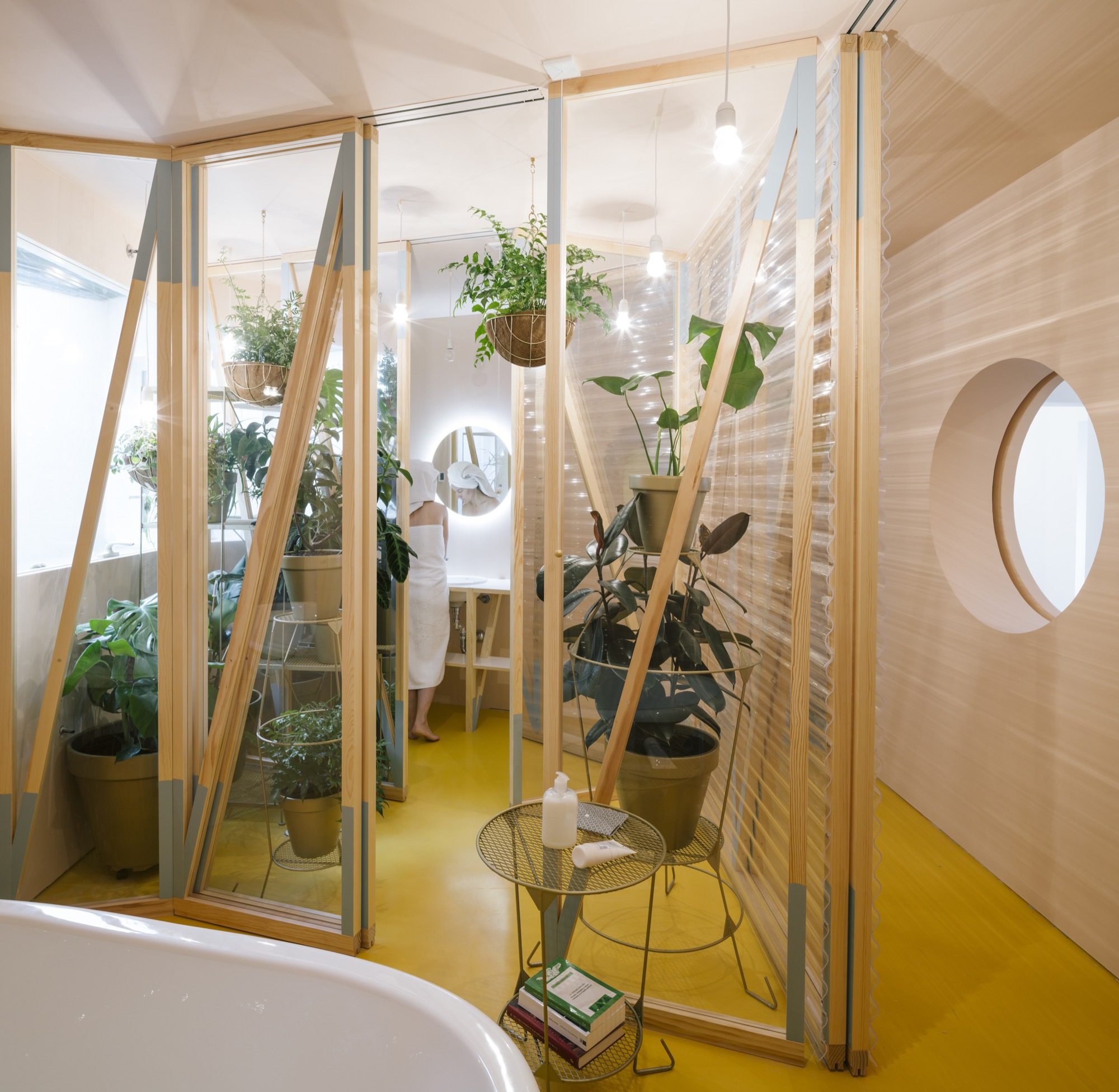 Between the bathtub space and a more private room with shower and toilet, facing the south window, there is a small greenhouse, equipped with a drip irrigation system, which accommodates different types of ferns, rubber plants, philodendrons and marantas, among others. It is the only space in the flat where underfloor heating was not installed, in order to prevent drying out the atmosphere of the garden. Instead, the garden is heated by its contact with the other spaces in the apartment and by direct exposure to sunlight through the window.