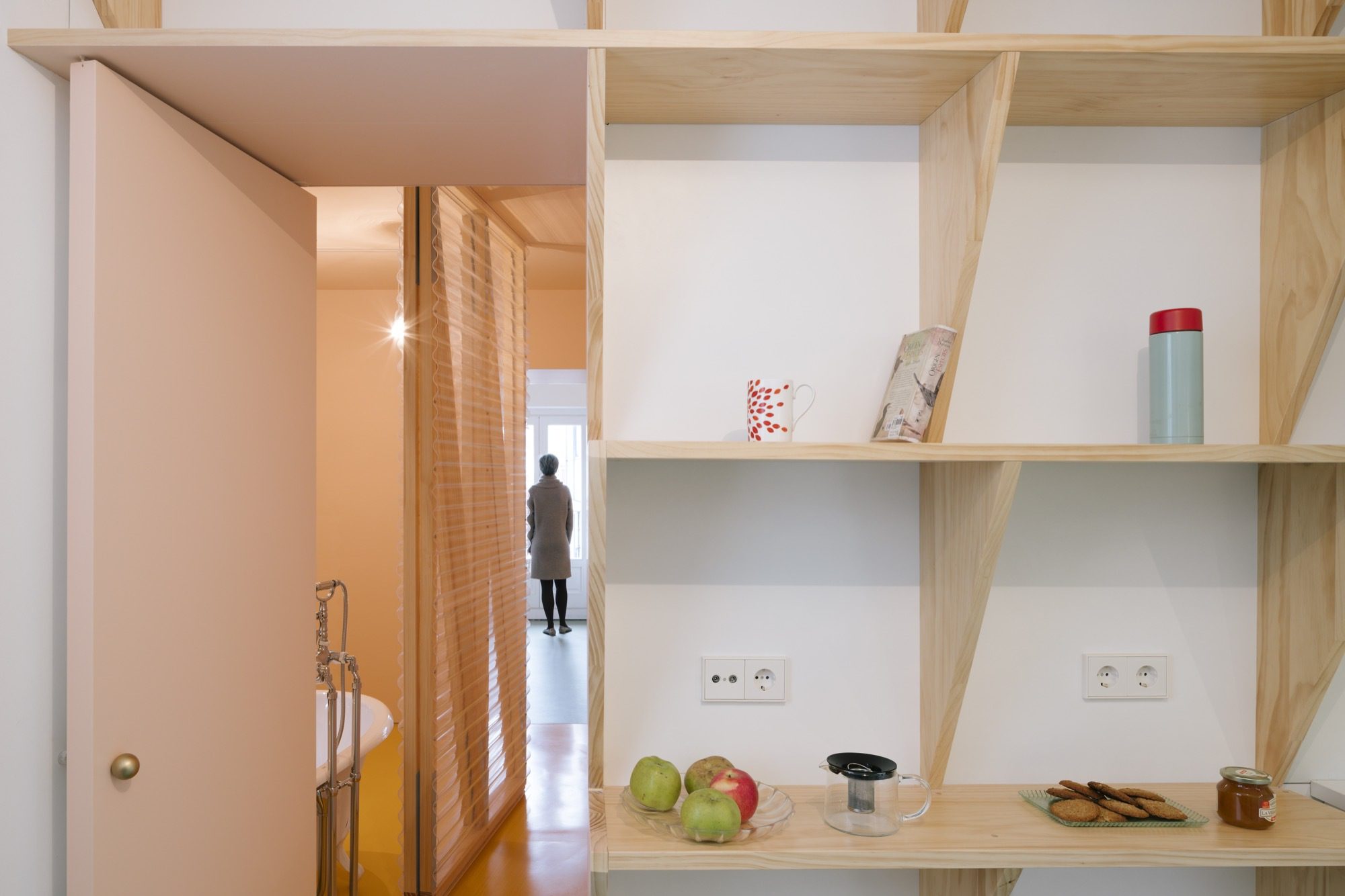 The original apartment was transformed by introducing a few changes in the partition walls while maintaining the original structure intact. With simple modifications, the project reoriented a large part of the house to the south. This was achieved by creating a new type of domestic interior: a bathyard, a space that generates a new “exterior” inside the apartment and lends passive thermal and light comfort to the entire home. The bathyard is a space whose character can be negotiated and altered by the users by sliding transparent partitions and opening out a folding bench. It is a place where different activities can overlap and be shared, such as trying on clothes, enjoying breakfast, or having a conversation while one is taking a bath and the other is sitting on the folding bench. And of course, it can also be the setting of a glorious solitary bath experience.