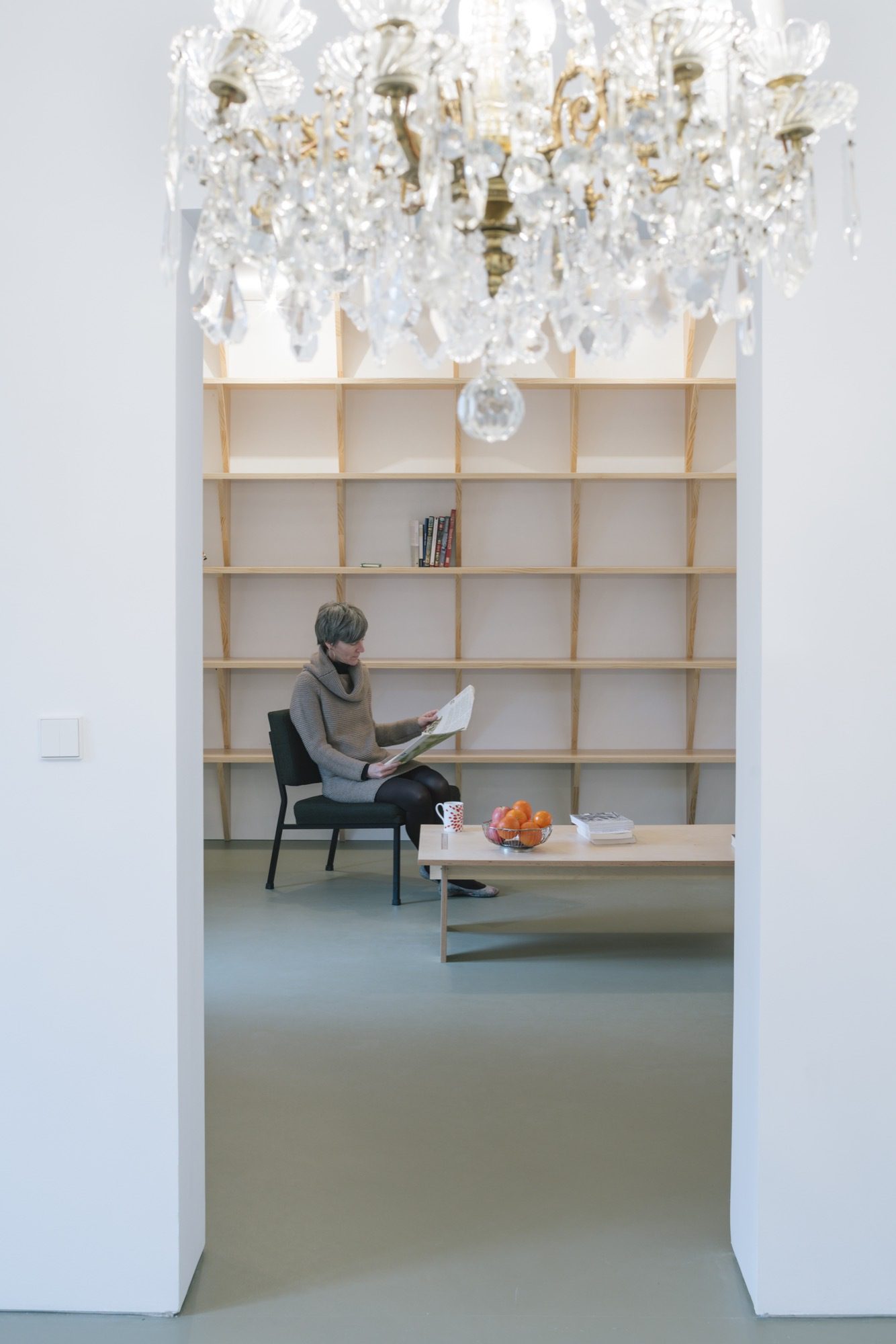 The construction of this oculus, making use of a preexisting hole in the load-bearing wall that once formed part of cabinet, connects the bathyard with the living and dining spaces visually and climatically. A curtain, and a screen on the circular window control airflow and light, help to adjust the atmosphere in the living room and adapt it to spending time watching films and TV, depending on the wishes of the mother and her sons, thus connecting or separating the different social spaces in the house.