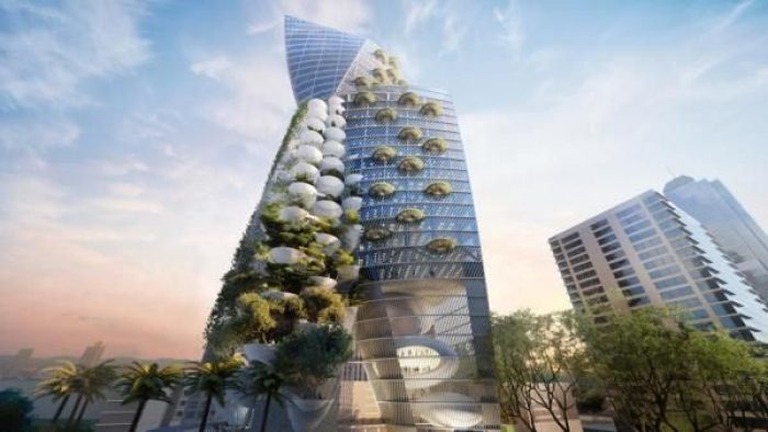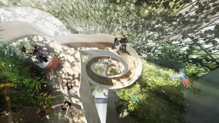 The building is a multi-level landscape beginning from an expansive public park on grade to a vertically-hanging arboretum along the circulation cores, and up towards a health-themed urban roof farm.