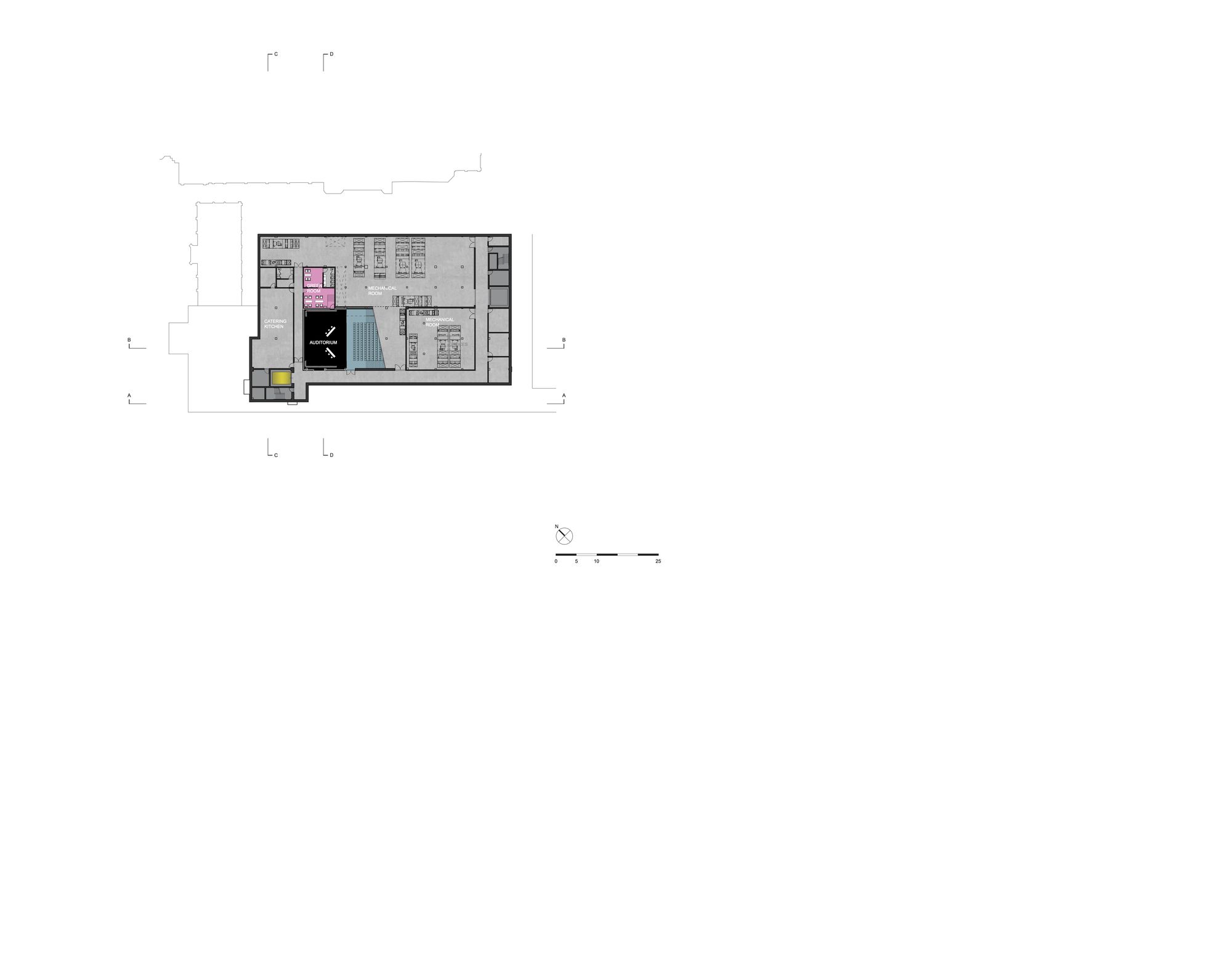 A series of stacked boxes remind the programmatic relations of Seattle’s Library, while generating an interesting grand hall facing the street with urban qualities. The three stacked galleries vary in size, the axo and models included contemporary exhibitions (50m x 50m), the permanent contemporary collection (45m x 35m) and design / Inuit exhibits (42.5m x 25m). The cantilever over the street creates the grand hall, a 14 meters tall transparent space connected to the park, is a starting point of an ascending path trough the boxes.