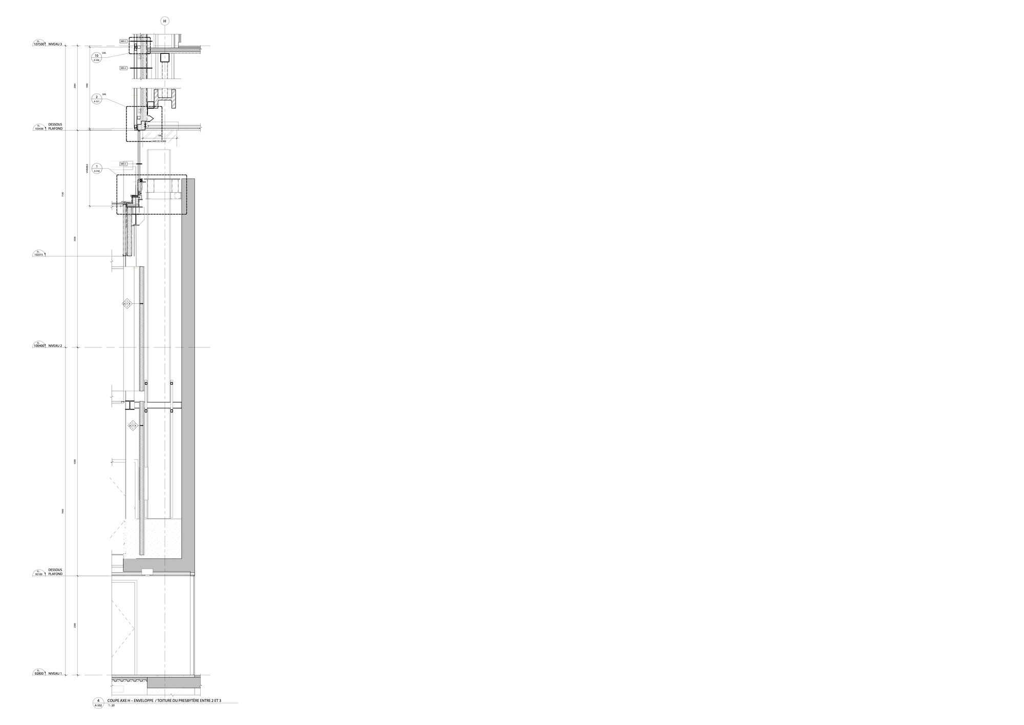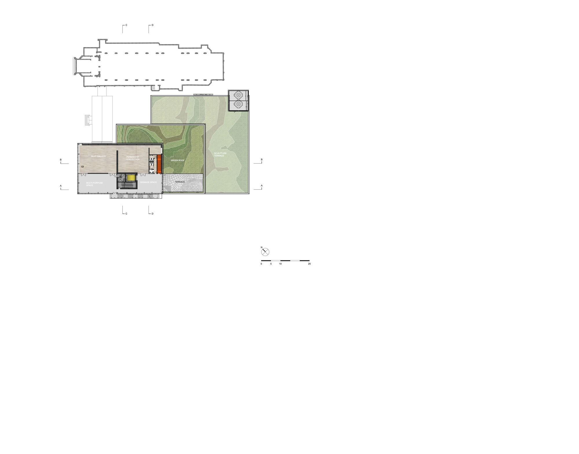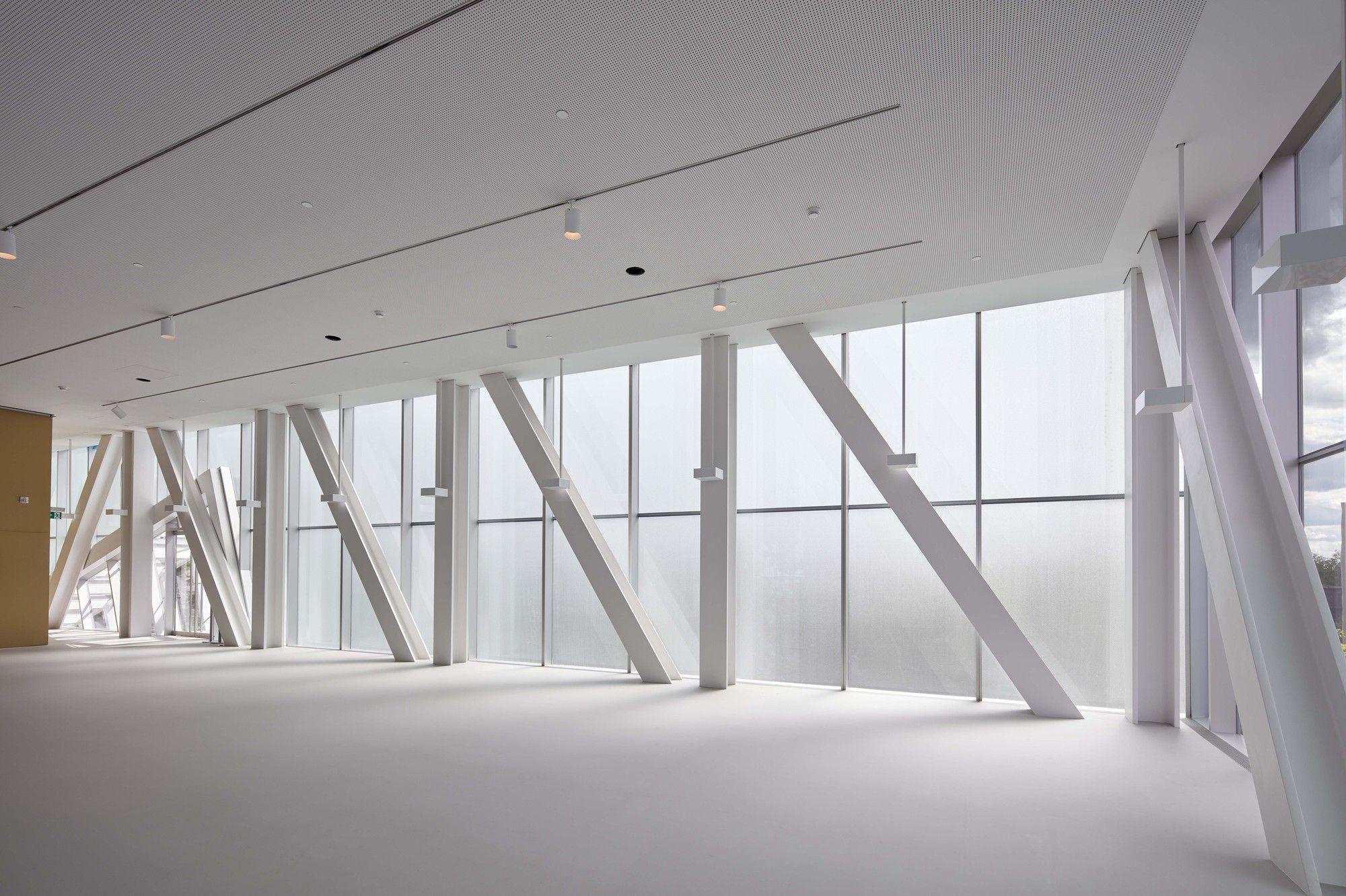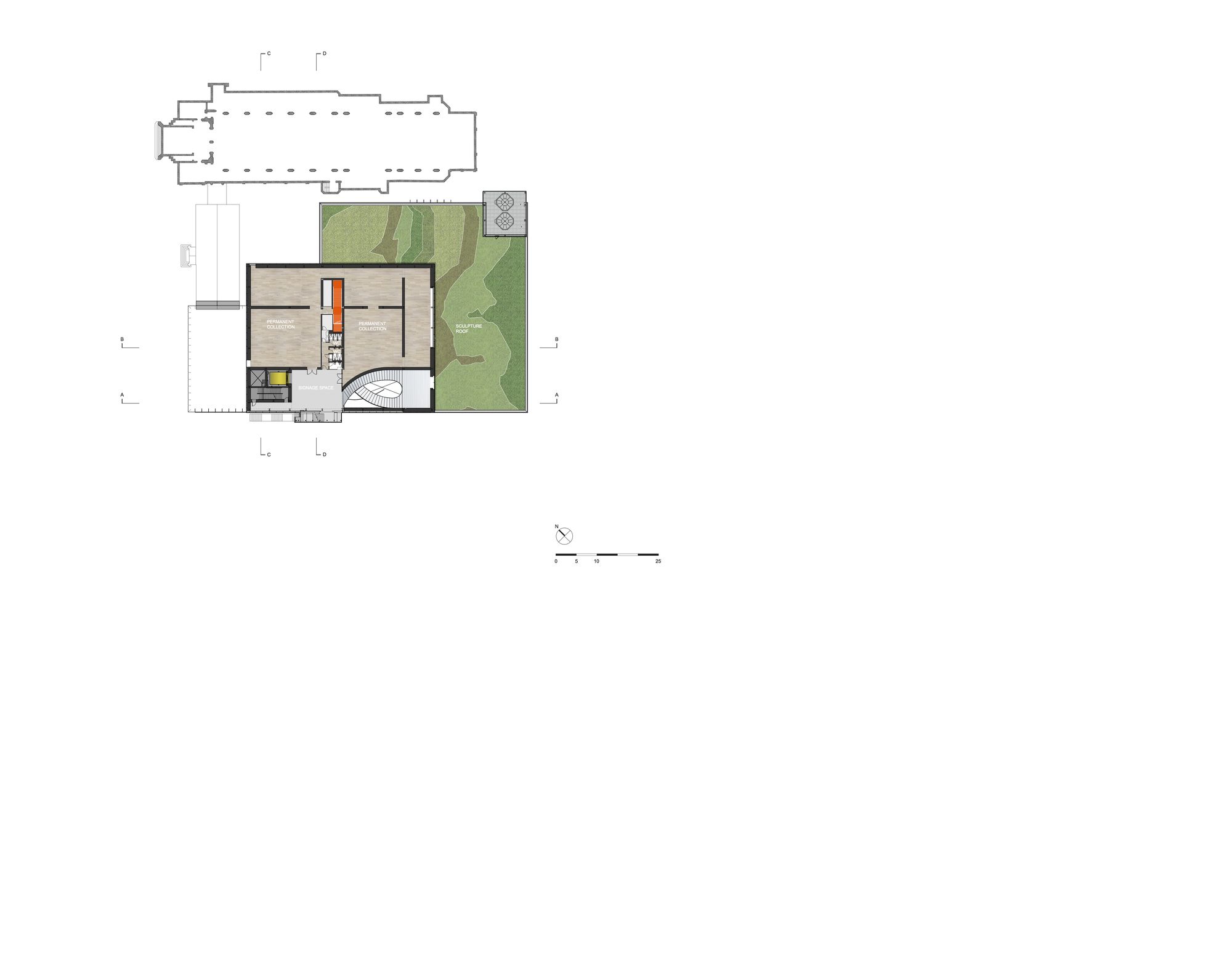 The new building provides a 90% increase in exhibition surfaces, connected to the museum’s existing buildings by a passage way rising 8.2 meters over its 130 meters length, creating a permanent home for the museum’s 40 meters ‘Hommage à Rosa Luxemburg’ by Jean-Paul Riopelle. Through its sheer length and changes in elevation, the passage creates a surprising mixture of gallery spaces that lead the visitor to the rest of the museum complex.