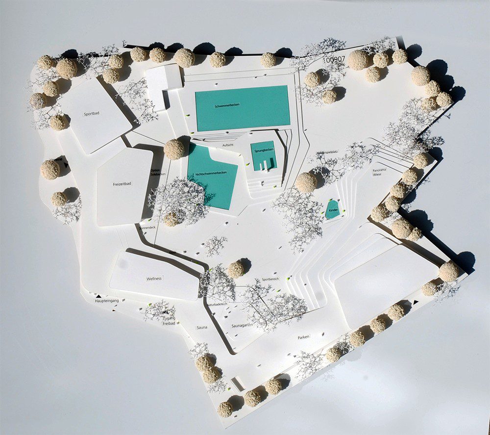 The Indoor Swimming Pool and Leisure Pool Competition, Behnisch Architekten received the 2nd prize with their submission to the Indoor Swimming Pool and Leisure Pool competition in the Bavarian Town of Freising, Germany. The location of the new indoor swimming pool and leisure pool has had a long bathing tradition. Located at the open air pool in Freising, Bavaria, it’s characterized by the lush greenery and mature trees.The human scale and the surrounding landscape are both dominant aspects of the design concept. It can be described as a topographic architecture, playfully connecting existing green areas.