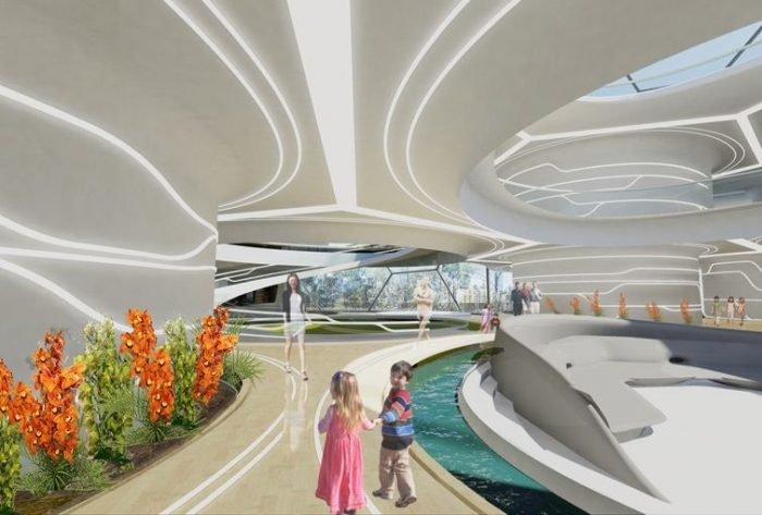 Away from the pollution and noise of the city, an ETFE geodesic sky dome provides a year-round microclimate that opens up the home to a garden filled with sun, light and fresh air.Visitors will experience fifteen different living spaces, from internal/external bathroom zones to kitchens flowing to veggie patches and barbecues to sunken bedrooms with dream inducing lighting.