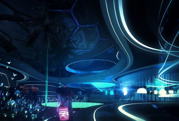 At night the home and the tropical garden turn into an otherworldly experience, with the underlying technology, the electronic veins of the system, coming to life. Technologies are invisibly integrated to satisfy everyday needs and senses. Its fluid design and organizational strategy based on cells is easily modified to suit specific requirements. It integrates the latest improvements in comfort and instantaneous information technology. Smart floors and walls with lighting and heating sensors, intelligent surfaces, and fully integrated media displays showcase comfort and sustainability for ‘homebodies’ of the future.