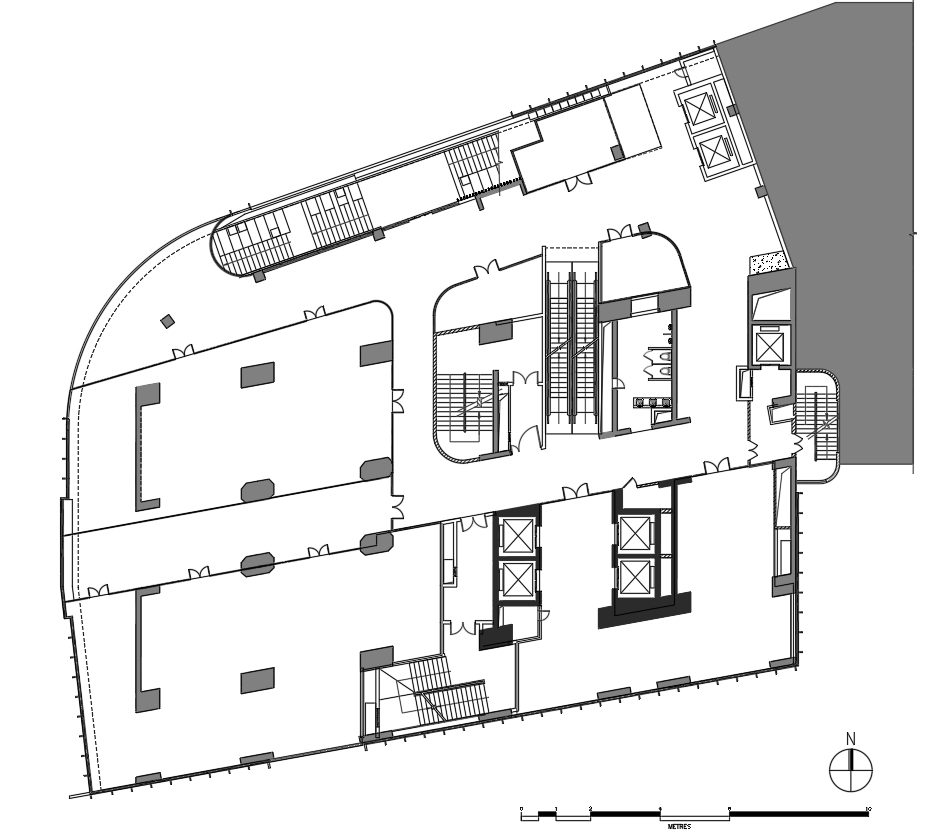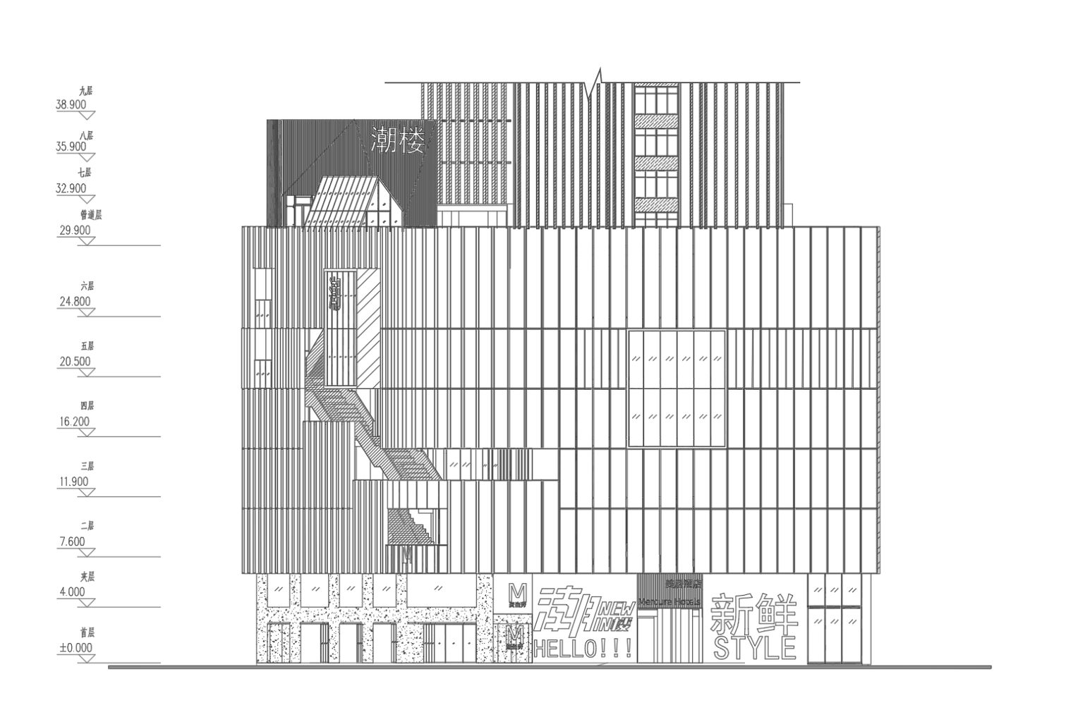 The Chao Building is surrounded by historical arcade buildings. On both sides of Beijing Road, traditional Lingnan-style commercial buildings feature elevated arcades at their base, so the design concept transformed the horizontal street into a vertical one, incorporating elevated arcades on each floor of the Chao Building to form a multi-level commercial street, embodying Lingnan cultural elements.