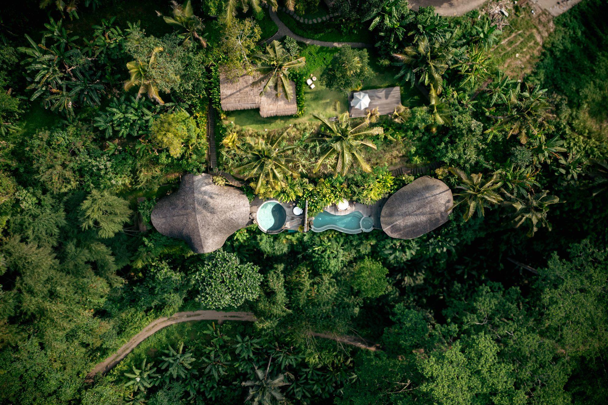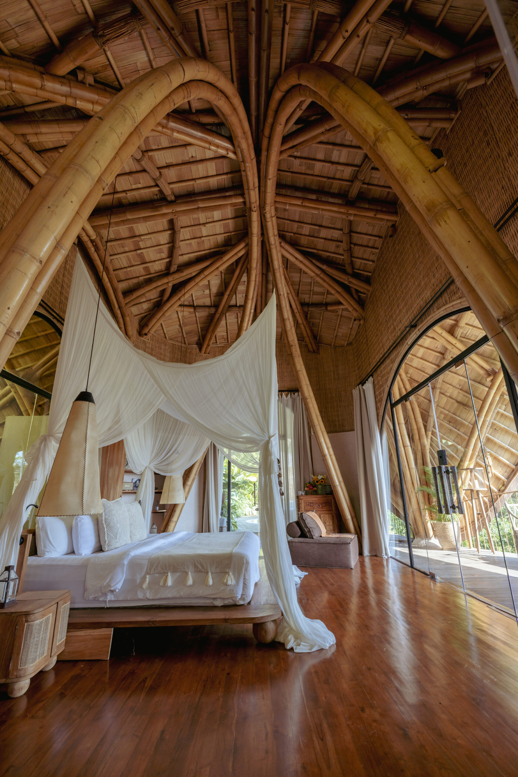 The structure rises as though shaped by the land itself, with arched bamboo frames that spring directly from the ground to form the roof without the use of straight columns. This continuous rhythm creates a seamless envelope that feels protective yet light, blending the villa naturally into its jungle setting.