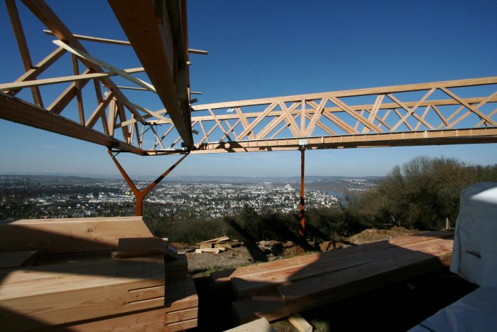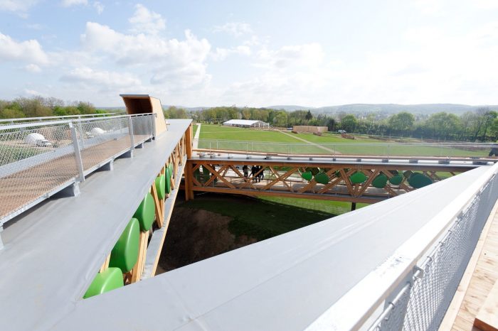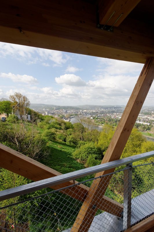 The choice of Douglas fir and other materials – and above all an examination of the site’s morphology – allowed this “architectural object” to encompass these concerns. As a largescale construction, the structure can be seen from afar, but its grace and horizontality allow it to blend harmoniously into the valley’s landscape. The surrounding park’s features were also determining factors. In response to the organizers’ request that the project respect the historic nature of the site, the belvedere’s location and angular design were chosen to reflect the fortress’s foundations and the garden pathways, which appear to cantilever out over the valley and the Deutsches Eck.