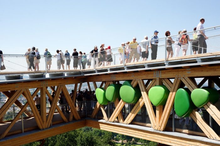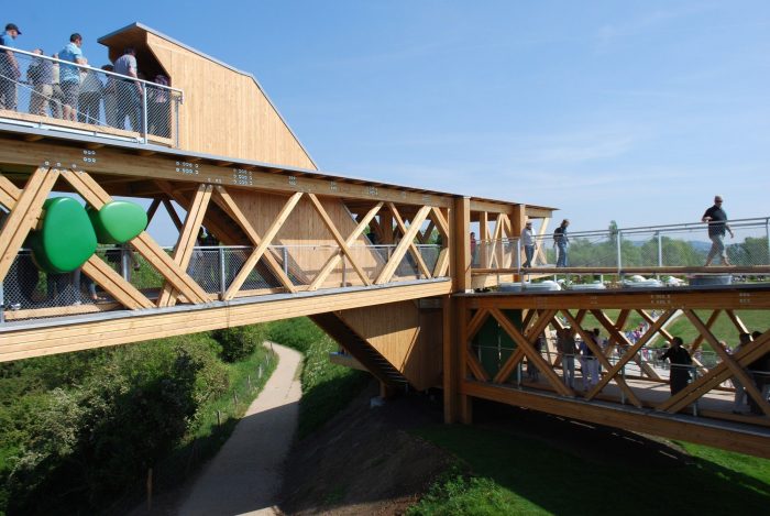The cantilever symbolizes the project: it extends more than 15 meters out over the valley and rises 10 meters above the ground. The choice of materials (native wood species for the structure and walkway, and Cor-Ten steel for the structural elements), meant that the entire construction could be pre-fabricated. The marriage of architectural research, and engineering to ensure stability, have resulted in a lightweight structure with dynamic visitor circulation. The lateral trusses create a mosaic of the surrounding countryside and allow the structure to be relatively free-standing.