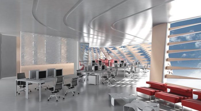 The particular plant has been designed to enable all areas to benefit from natural light and panoramic views. A split-level layout of the interior has the capacity to mutate and reconfigure repeatedly over time. The logic of “Open Space, and column free structure (thanks to the thickness of the floors and construction technology), provides a variety of different spatial configurations through a system of movable walls that will dialogue with the presence of discontinuous mesh that in turn assumes the role of, connector, separator, and part of furniture or a simple visual separation. An integral part of the project is the search of an identity between the form and the structure, obtained by the interweaving of the two, JUST LIKE A FABRIC.
