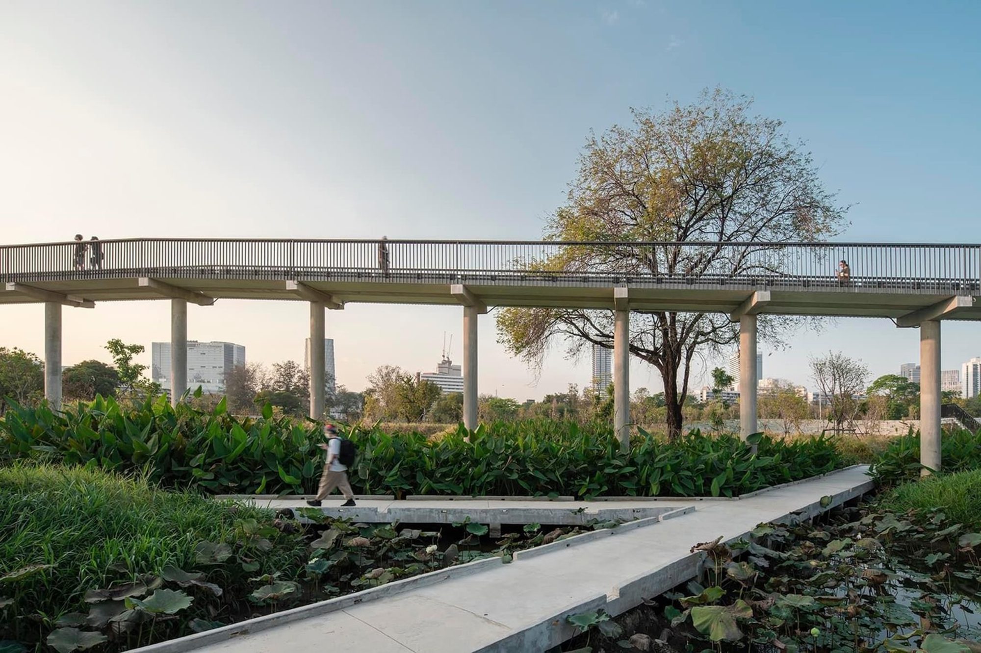 The park is accessible by all, from people around the surrounding community to people throughout Bangkok who want a space to immerse into the holistic ecosystem. Islands within the wetlands also serve as sanctuaries for other species to seek refuge. The area within the park is connected by a 1.67 km long skywalk, with a universal design. The Skywalk is a leisure and nature learning path. Variety of spaces, inclusive for all ages and groups are integrated such as bicycle ways, paths under tree canopies, a boardwalk, a healing garden, a sunshine lawn, and a waterfront pavilion with an amphitheater. The renovated factory buildings will also become museums and sports centers with sunroofs, high-ceiling ventilation systems, and trees for indoor air quality will make the buildings energy-efficient within a limited budget.