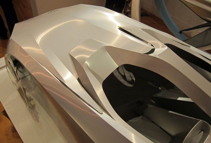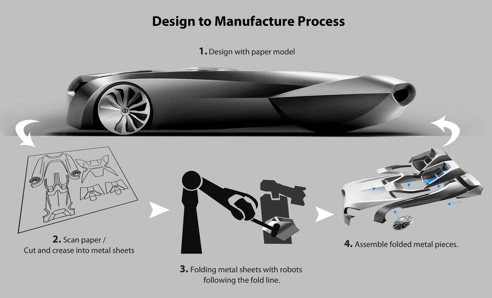 This project uses a technology called ‘Robofold’, which is building car body panels by folding sheets of Aluminum with Robots.It provides energy saving, simple and low cost manufacturing system to small batch production.Also, designing by paper forming allows sculptural and natural new design language in form.” by Kyungeun Ko