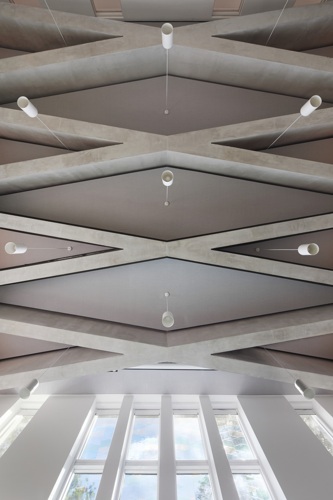 The exterior of the new building is defined by a regular concrete grid, with brick infill panels arranged in a raking monk bond. This pattern is inspired by a series of bold diagonal ribs that form the ceiling of the double-height church space, which are themselves references to the cross vaulting in traditional churches but reinterpreted to form a contemporary aesthetic. These beams penetrate into the office spaces above, forming gaps to bring more natural light into the space below and reinforcing visual connections between the different functions of the development. The crossing pattern is also picked up again in a dramatic blue and green stained-glass window – created by Coralie Bickford-Smith, an award-winning designer, illustrator and author.