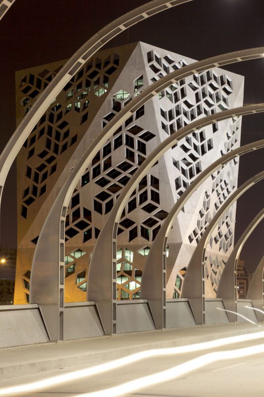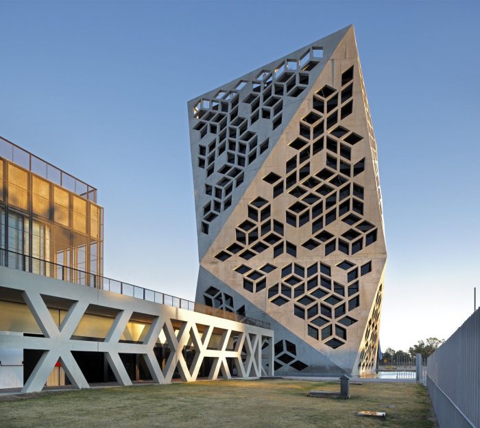 The medium-rise building made out of concrete houses the ministries and dominates the complex. It is based on a square cuboid 45 meters high and with a side measuring 26 meters, which at a height of 16 meters suffers a 20 degree rotation. The structure generates a complex morphology based on triangles creating a prism that plays with shadows and light. The openings were generated from a series of geometric rhomboid-based combinations designed to instill a tri-dimensionality to the flat character of the facades. The form is placed over a shallow reflecting pool that can easily be emptied to work as a civic plaza housing events.