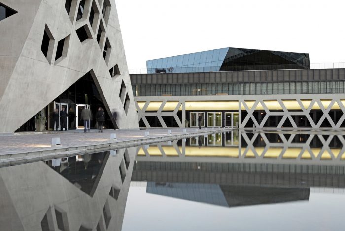 The two finished buildings of the completed stage one phase; take up an area of roughly 24,781 square meters. In the second stage the administrative area will be completed, and a Convention Center will be built as a third and final stage to the design. The Convention Center will be partially buried, and will take the shape of an artificial, grass-covered hill, in continuity with the adjacent landscaped areas.