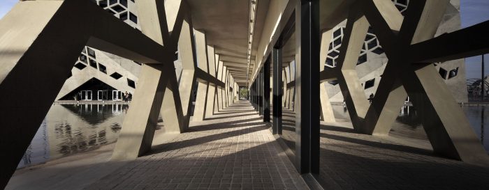 The change in design the prism building went through from proposal to completion is interesting to note. Originally the concrete structure’s facades appeared lighter, existing entirely of the rhomboidal openings that created a web or lattice quality to the buildings appearance. Either for structural purposes, sustainability reasoning, money shortage, or any of the other variables that appear during construction and the completion of all architectural projects, the main prism building has developed a new character due to the change in façade appearance, whether for better or for worse. It will be interesting to see the entire project finished and how the completed administrative areas and Convention Center help to finish the thoughts and visions the architects had for this site.