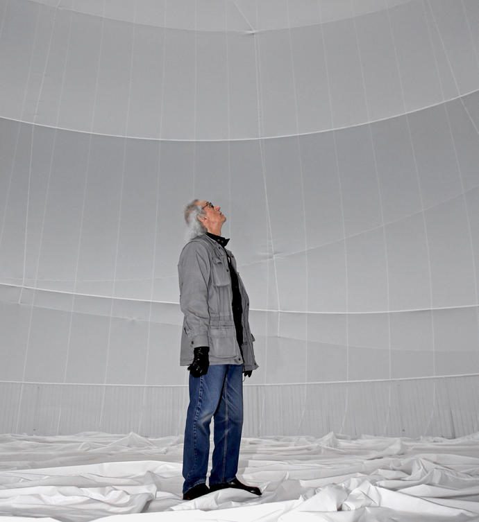 This gargantuan sculpture uses 20,350 square meters of semitransparent fabric and 4,500 meters of rope to produce a 90 meter high (295 feet) and 50 meter wide (164 feet) cylinder shaped balloon. Two fans are used to keep the package upright and pressurized with a volume of 177,000 cubic meters of air.