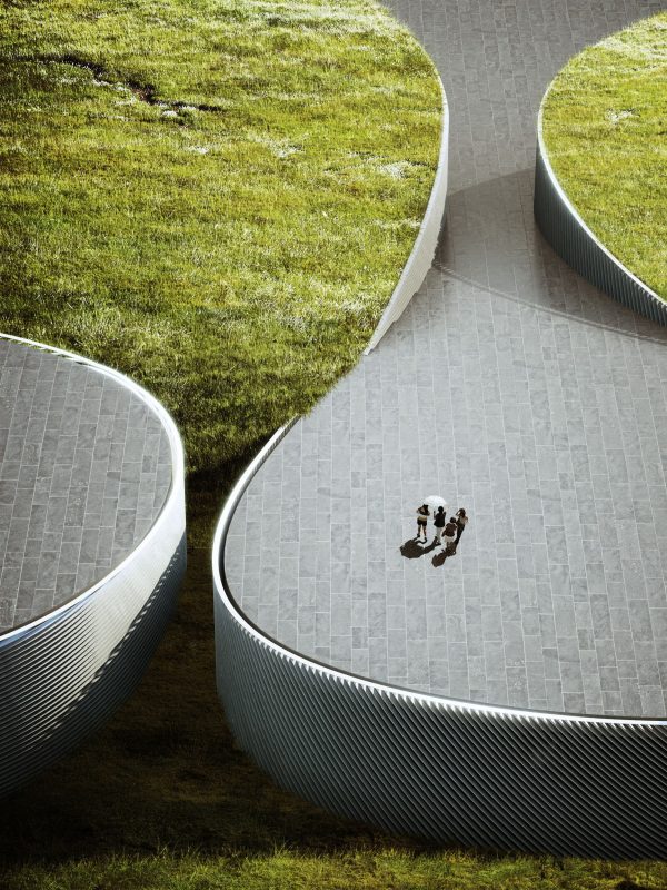 ‘Like the mixture of two incompatible substances – oil and vinegar – the urban pavement and the parks turf flow together in a mutual embrace forming terraced pockets overlooking the park and elevating islands of nature above the city. A series of seemingly singular pavilions that weave together to form a unified institution – like individual fingers united together in a mutual grip’, explains Bjarke Ingels.