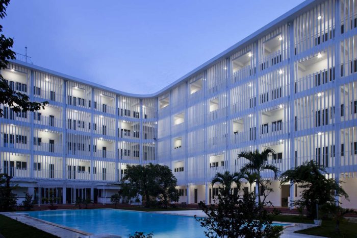 The building is located in 5300 square meters abundant land, consisting of a maximum height of five levels, with the intention of being surrounded by the height of the forest around. Precast concrete louvers and pattern walls are used for an envelope of the building. These shading devices generate semi-outside space, these open circumstances avoiding direct sunlight as well as acting like a natural ventilation system for the corridor space. All the classrooms are connected by this semi-open space, where teachers and students chatting, communicating and appreciating nature. We designed the school as a continuous volume in order not to disturb any school activities. This fluidity concept is inspired by the endless raining of the typical tropical climate, where raining season lasts from May to November each year. This continuous volume has a gentle slope surrounding the two courtyards as a geographical hill, lessens the aggressive height between the building and the peaceful site.