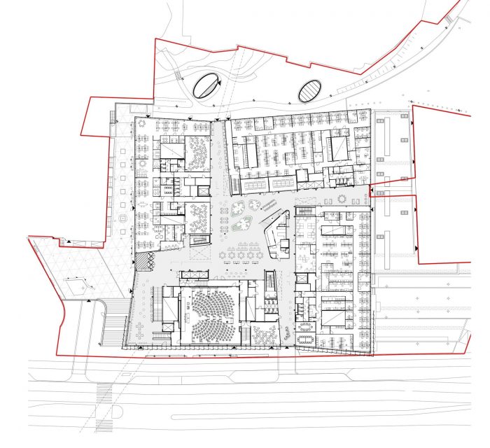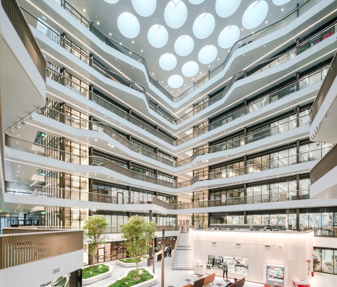 The new construction is not only intended to provide a building in the campus park, but also to accommodate the park within the building. With a glass-covered green atrium, the outdoor campus area is continued through the building, thereby reinforcing the social qualities of the green campus to the benefit of knowledge-sharing and interdisciplinarity.