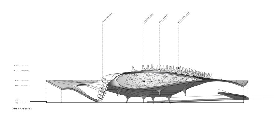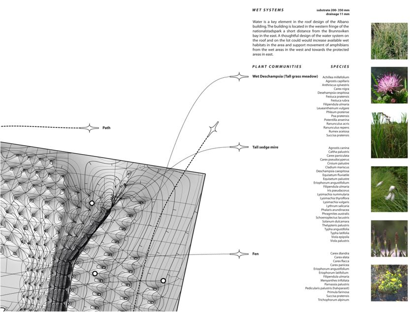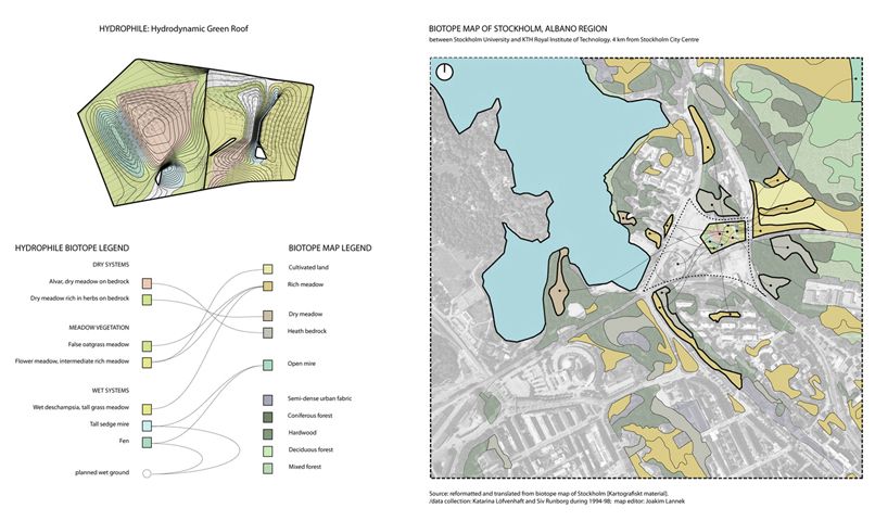 Hydrophile, is a very interesting proposal for a 4,000 square meter Bioscience Innovation Center located in Albano region of Stockholm. The center features a hydrodynamic vegetated roof that has an enough depth to make the plants and other vegetation to be covered or submerged in water. On the other hand, the roof is designed in such a way that the water can be directed towards certain areas of depression where it gets stored to support wet meadows and fens, and its surface has varying degrees of thickness to support a variety of vegetation species. More details from the architect come after the jump.