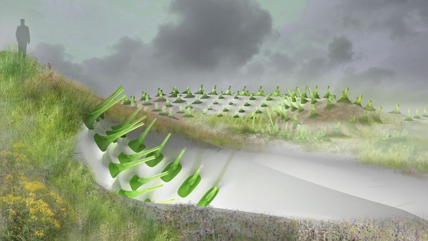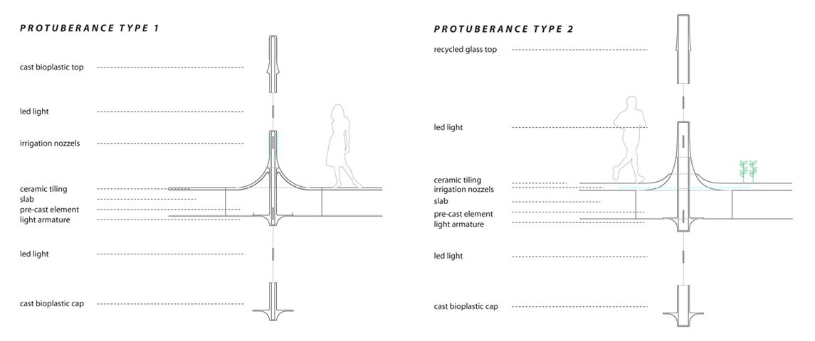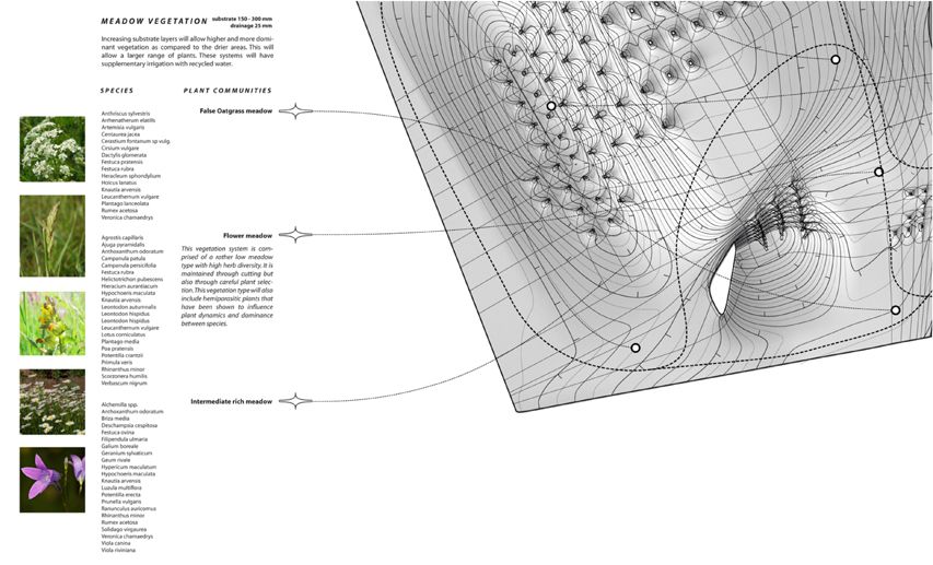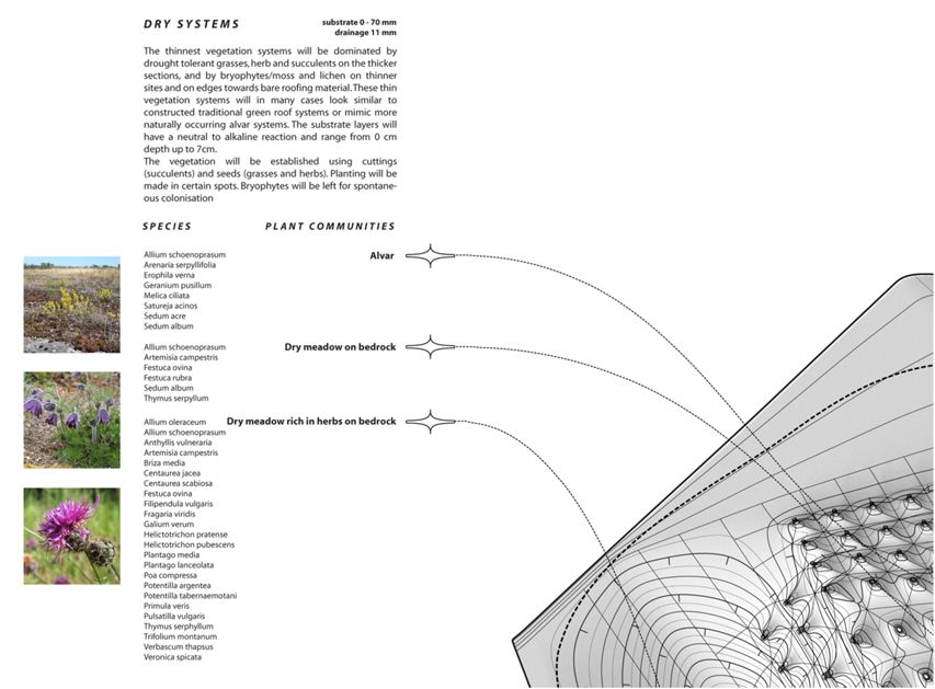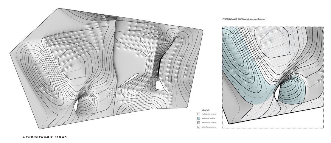 The material properties of ceramics with varying degrees of porosity and surface treatments are coupled with a morphology of protuberant forms in order to perform as hydrophilic and hydrophobic agents. The protuberant morphology of the roofscape directs the flow of water to irrigate organic matter—dirt. The main driving factors for the design of the Hydrophile building and its plant communities are the substrate thicknesses, substrate design, and the roof topography and geometry. The roof topography is used to direct water to depressions where large amounts can be stored to support wet meadows or fens. Substrate thickness is used to create vegetational gradients ranging from shrublands and meadows on thicker substrates, to dry meadows and heathland on thin substrate layers. The roofscape is incorporated into a system of urban green surfaces that provide important links for the migration of species, possibly supporting existing biotope structures and habitat networks and promoting biodiversity in the local environment.