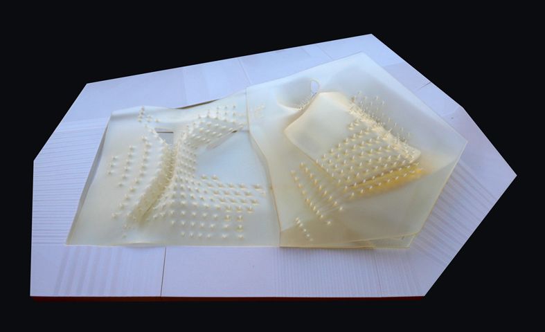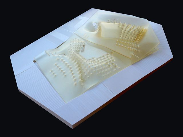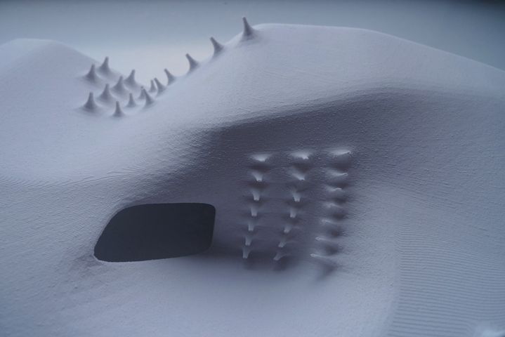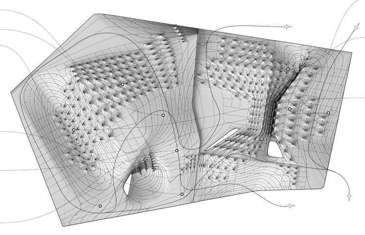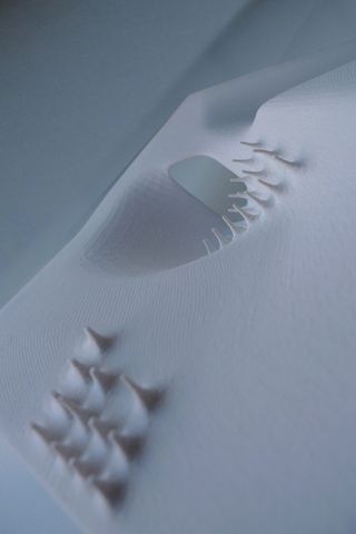 The Hydrophile derives its name in part from the hydrodynamic properties found in the shell of the Namib Desert beetle. A coalescence between formal and material performance occurs at a micro scale in the shell of the beetle where hydrophilic—water attracting—and hydrophobic—water repelling—regions are interspersed to collect and direct the flow of water. In the Hydrophile prototype, this principle is applied on an architectural scale for the design of a hydrodynamic green roof system. The primary performative aspect of the Hydrophile is the cultivation of biotopes on and through a variegated roofscape augmented with systems for percolating water through soil substrates.