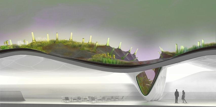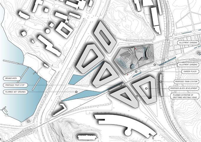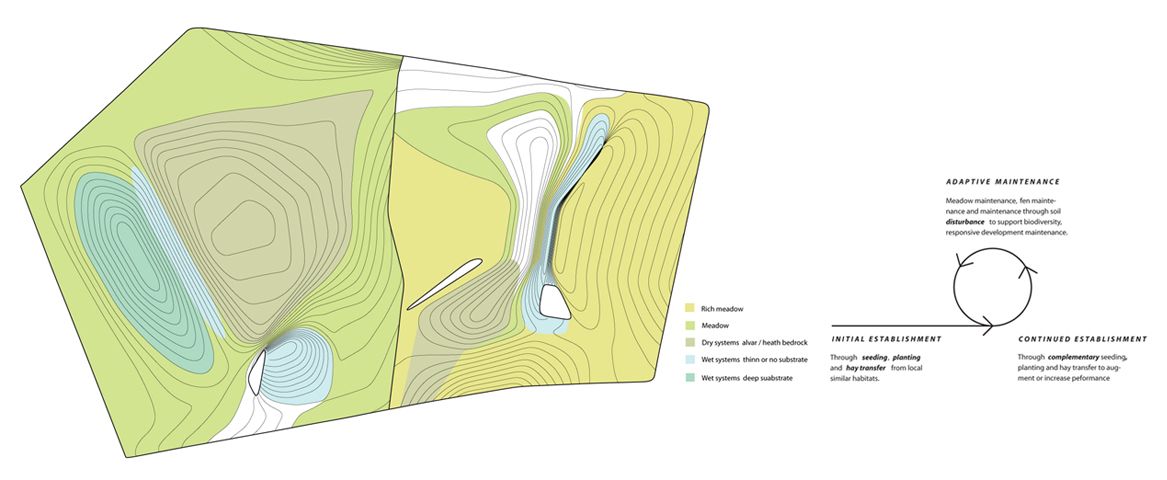 This speculative proposal for a 8,000 sqm bioscience innovation center with a hydrodynamic vegetated roof, located in the Albano region of Stockholm, reconsiders the extensive green roof typology to produce an occupiable roofscape characterized by immersive depth. The green roof is designed to be experienced from several vantage points: from above—walking amidst a dense landscape of indigenous vegetation intertwined with protuberant forms that emit water, air or light; from below—as a underside of the roof pulls down to close proximity with the floor; or from within—in the interior of the auditorium space and specialized laboratory areas designed for the cultivation of vegetation in semi climatically-controlled microclimates.