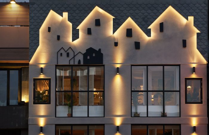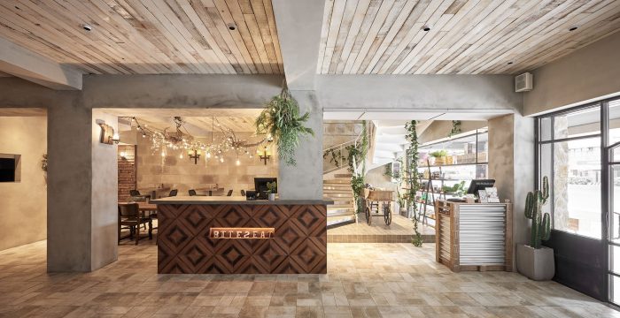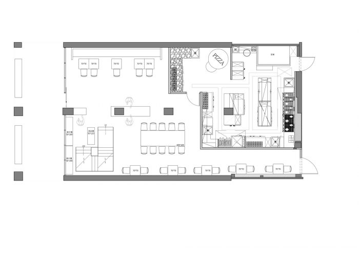 Inspired by simplistic yet gorgeous Italian houses, the facade of the restaurant features the silhouettes of many small houses, creating an inviting scene. The first-floor porch has an arched design and two benches, creating a simple and relaxing area for customers to meet, wait, and chat. At the entrance is a cast iron gate of intricate craftsmanship, accented by kiln-fired tiles on the ground to recreate a scene of a European street. Another arch is built to allow a view of the pizza oven within, so that people can peer into the goings on in the kitchen, turning the baking process into a mysterious ritual performed to summon delicious food. The subtle yellow lighting creates the slightly dimmed but warm atmosphere of a pub.