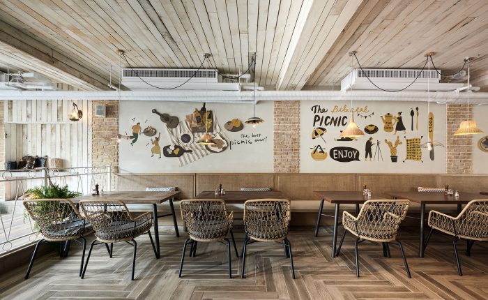 Bite to Eat is HAO Design, At a party in an Italian manor, some people dine around a table in the dining room, some set up tents around the house, while others leisurely bask in the sun on park benches. How to put all these relaxed, happy events into one room?