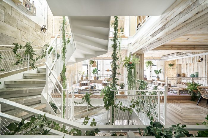 The height of the chair is purposely lowered to be closer to the ground for a camping experience. The variety of seating styles allows customers to easily select their favorite seats. Plants on the third floor comprise mostly ferns and succulents. Paints with wild textures are selected, paired with hemp hanging lights that have more defined shapes. An arched doorway designed like a cave is added, along with some “animal footprints” on the floor, ingeniously creating the primitive atmosphere of a cave, making this floor textured and dramatic, the first choice for customers wanting to throw private parties.