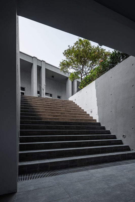 This base is lower than the main road, so we first set the elevation of the original base as a basement, and the first floor is raised and suspended; this type of tall house architecture similar to the South Island nation. We call it Singapore-style architecture at Taiwan. This type can effectively resolve the damp and hot ground gas, making the indoor space more dry and cool; in addition to the use of six cars and storage rooms in the basement, we have reserved a water collection box culvert in the foundation of the driveway to prevent the current Heavy rainfall in extreme climate. On both sides of the building, the suspended glass box is clamped by the amount of elevator and stairs, hoping to be light and stable at the same time. In 2F, because it is a private area, the facade is plated with aluminum grid to filter out too much sunlight and provide privacy Improve the overall refinement of the building.
