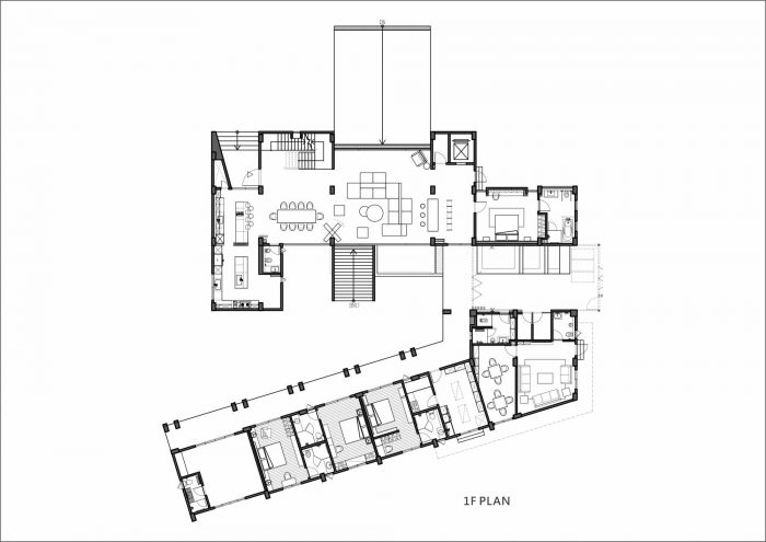 We divided the entire building into a front and rear building in a courtyard-like configuration similar to China. The front building is for the public domain and the main funded member families, and the rear building is for other family members and ancillary spaces. The semi-open air spa area serves as its transition space. The atrium between the two buildings provides sunlight and green plants and can be brought into the activities of family members.