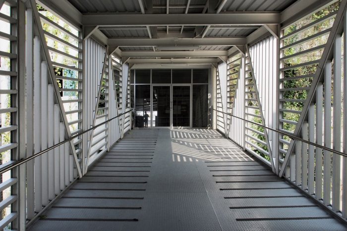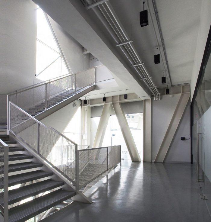 The truss structure also appears within the interior space of the third floor and these triangulated geometric patterns from structure were selected for the facade cladding pattern of the building’s exterior shell. The double-layered exterior shell for the south and west facade is the solution for such requirement with aluminum louvers whose forms are similar to those of ventilation fins of an air conditioner. The louvers welcome in the presence of natural light and outside surroundings.