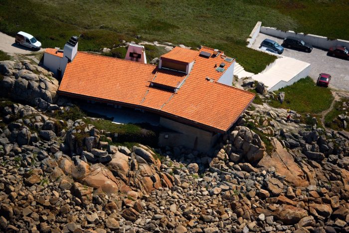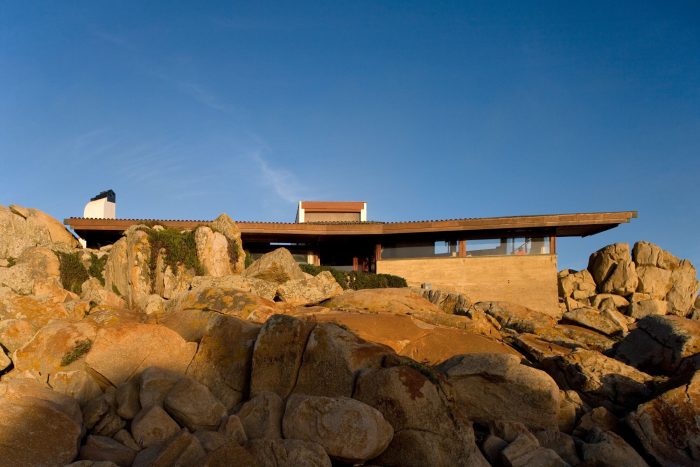 Removed from the main road by some 300 meters, the building is accessed from a nearby parking lot through a system of platforms and stairs, eventually leading to an entry sheltered by a very low roof and massive boulders characteristic to the site. This architectural promenade, a sinuous path clad in white stone and lined by painted concrete walls, presents several dramatic perspectives of the landscape as it alternatively hides and reveals the sea and the horizon line.