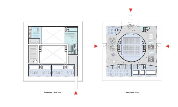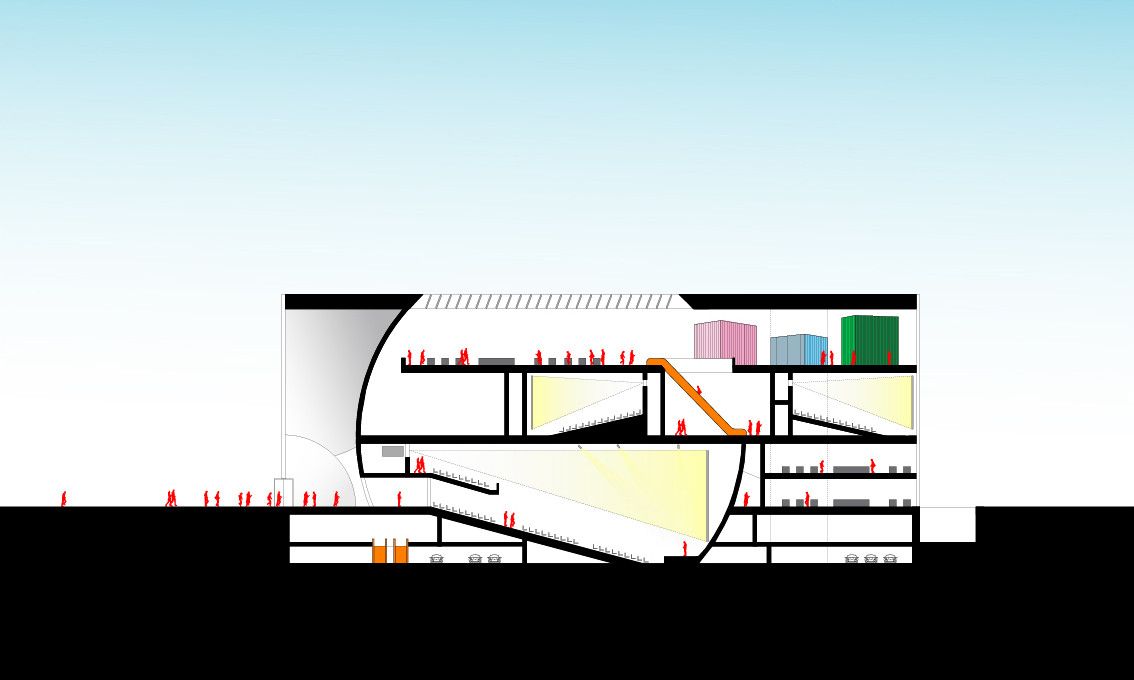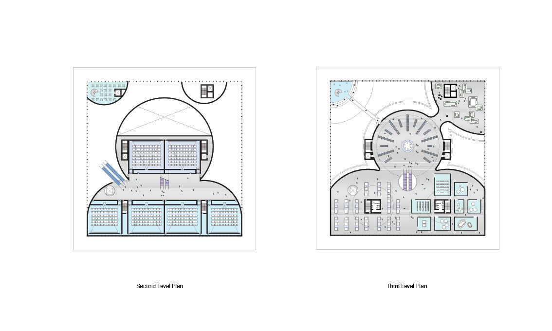 Each of the museum’s many programs is encapsulated in its own sphere, with pedestrian traffic directed between and around these by wide circulation paths. The importance of allowing an individual path for exploration of the building is done through overlap and interconnection of floorplans.