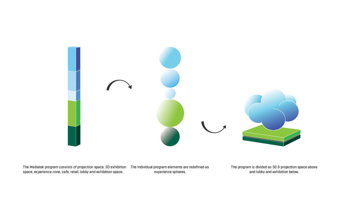 In section the project combines spherical forms with more conventional floor slabs and atrium spaces. As HAO founder Jens Holm describing “interactive surfaces and an expressive, bubbling interior [that] provides an immersive experience as rich as the 3D media it is built for.”