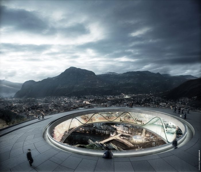 Snøhetta’s design is composed of two circular terminals at the peak and the base of the mountain, connecting each other through holes in the centers of the buildings. The cable course is at a tangent between the two buildings. Both terminals will have an unique design to characterize them. The one at the base of the mountain will introduce nature to the city, marking the end of the Südtirolerstraße. It will be a warm welcome for the visitors and will prepare them for the journey into nature. While at the top, the station will create an ‘urban interface with nature’ – offering the great views and in the same time hosting a restaurant, café, infinity pool and meeting rooms. The development will also include a ‘Mountain Square’ suitable for hosting events such as open-air markets and music .