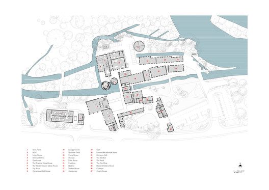 The master plan also proposed to create two new glasshouses to plant 10 exotic plant specimens to use for the distillation process. These glasshouses, on a humid tropical environment, and the other a dry temperate Mediterranean climate, are located in the northern still house with the waters of the widened river. This connection allows waste heat from the distillation process to be reused to maintain the temperature for the plants. More details from the architect come after the jump.