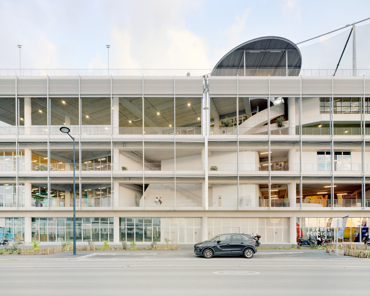 The UCPA Sport Station is a testament to sustainable architectural brilliance, ingeniously combining form and function. This remarkable edifice showcases a harmonious assembly of low-carbon concrete slabs, beams, and columns seamlessly integrated into the urban landscape of its district. Outdoor spaces are ingeniously superimposed, mimicking the natural flow of streets and city squares, all shielded by agricultural windbreaking nets that protect visitors from unwanted drafts.
