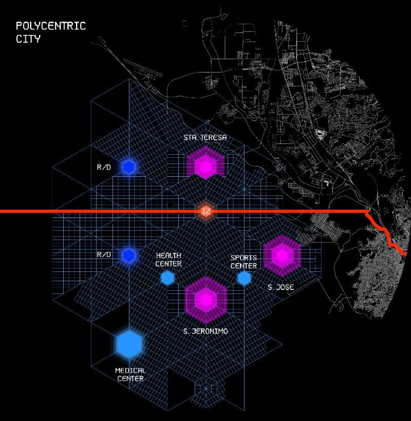 Border City presents a vision for a binational city on one of the world’s most important borders, that of the United States and Mexico, whose boundary states are now home to over 100 million people. The concept is rooted in the long history of places where frontiers meet, cities where cultures both clash and blend. This integrated masterplan is conducive to both sides of the border, drawing upon industrial, employment and trade opportunities, while recognizing shortcomings in urban planning. Romero’s urban prototype, with a hexagonal plan, might offer a new model for cities as populations grow, migration increases, and economies continue to globalise.