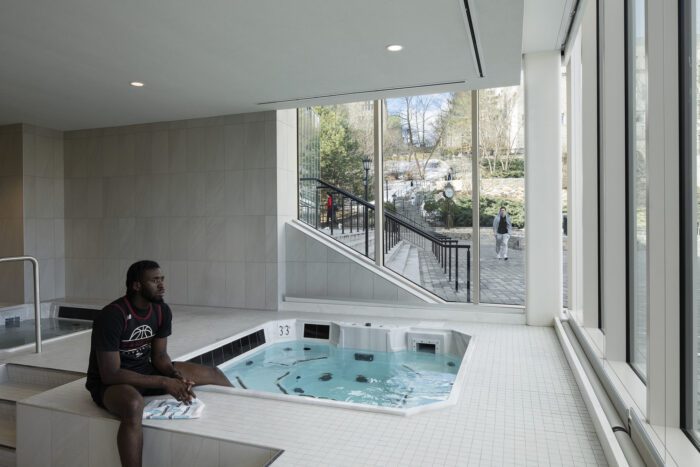 Additionally, the primary practice gym received a complete transformation. Formerly a windowless space that was shared with the volleyball program and included wooden bleachers, the practice gym is now a transparent space flooded with natural light and visible to the rest of campus. Opening the exterior wall from floor to ceiling and wall to wall involved careful structural details to support the curtain wall and improve the structure’s appearance. Not only is there added convenience, but the teams have a greater connection to the campus and their fellow students, who now can witness and better appreciate the dedication and time put in by the teams.