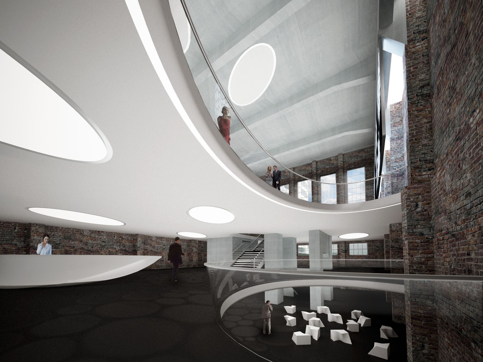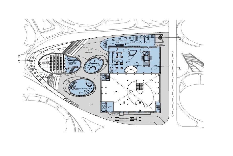 To activate the ground throughout the whole of the site and to provide public spaces of the highest quality, the underground car parking is covered by a one storey high, modulated platform. This has been perforated at strategic points for day-lit spaces that accommodate retailing, landscaped parks and various points of interest, including the cultural centre, museum shop, conference space and event halls.