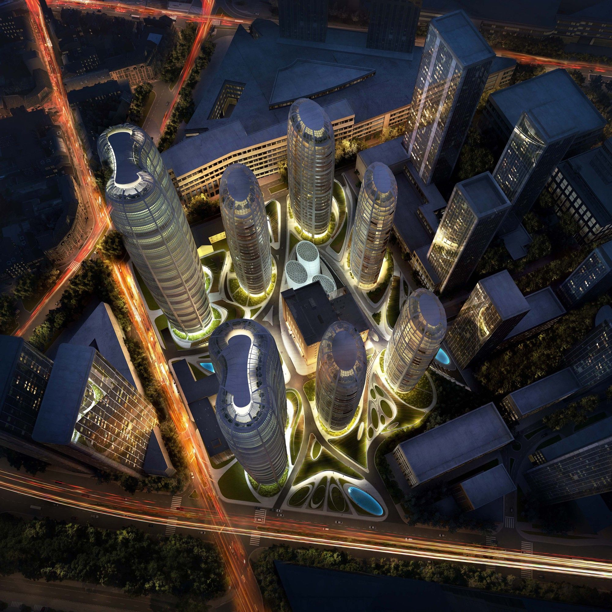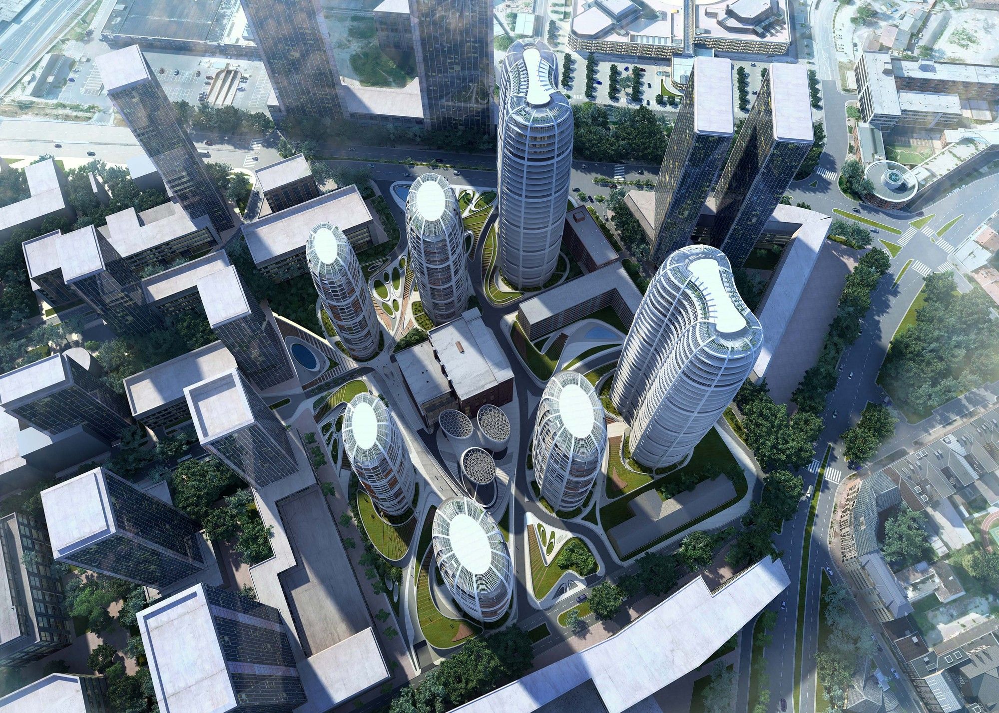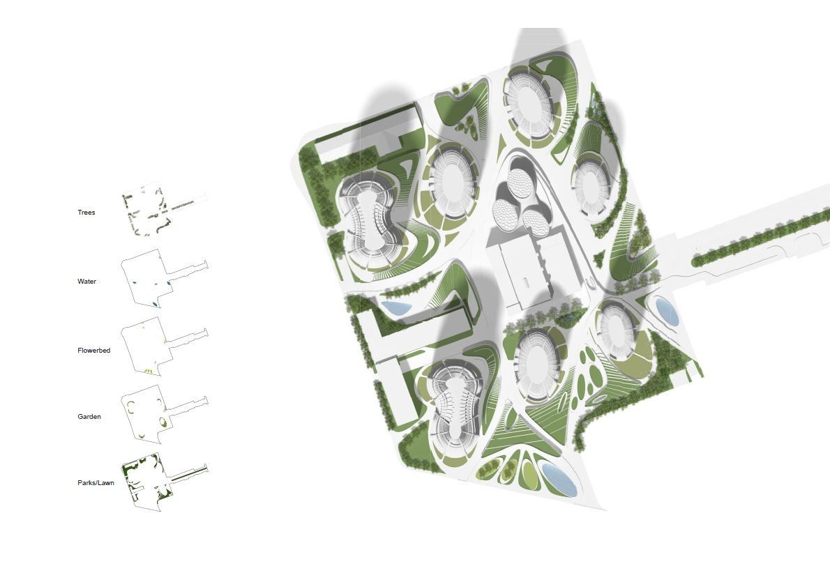 The design is based on a dynamic field strategy, which organizes the new city centre’s program along a gradient of circular and elliptical patterns. A fluid field emerges from the underlying matrix in the form of a series of larger tower extrusions towards the site’s perimeter and intermediate scale pavilion-like structures surrounding the cultural plaza- which is adjacent to an existing decommissioned power station.