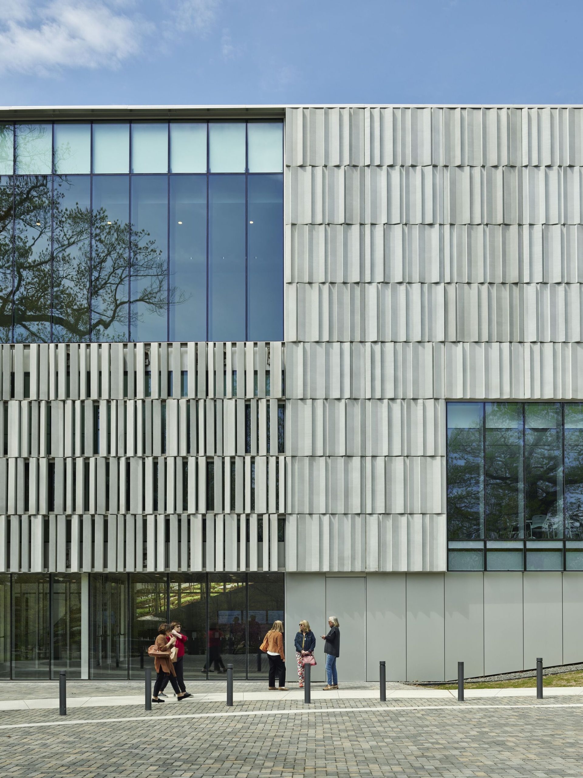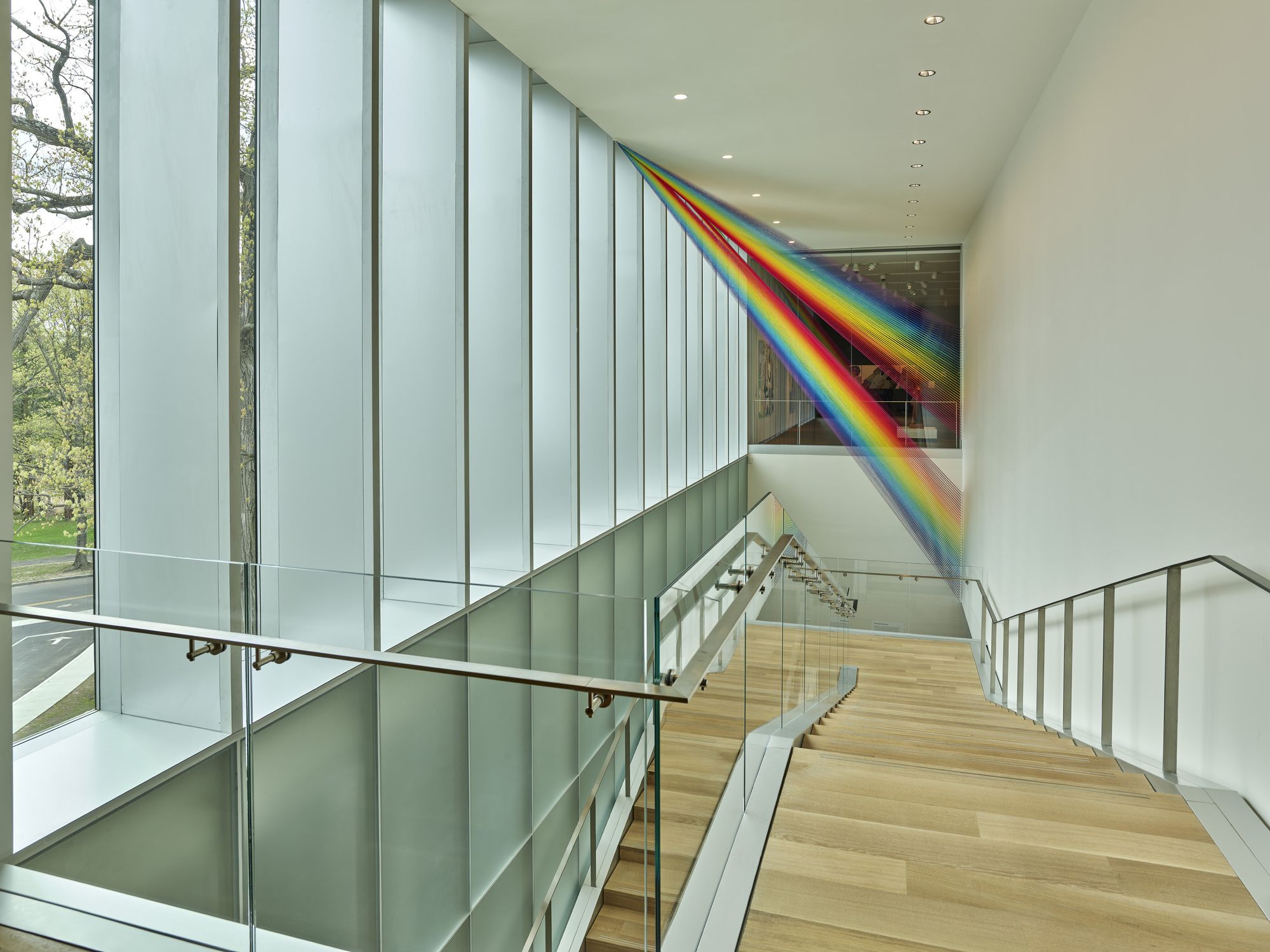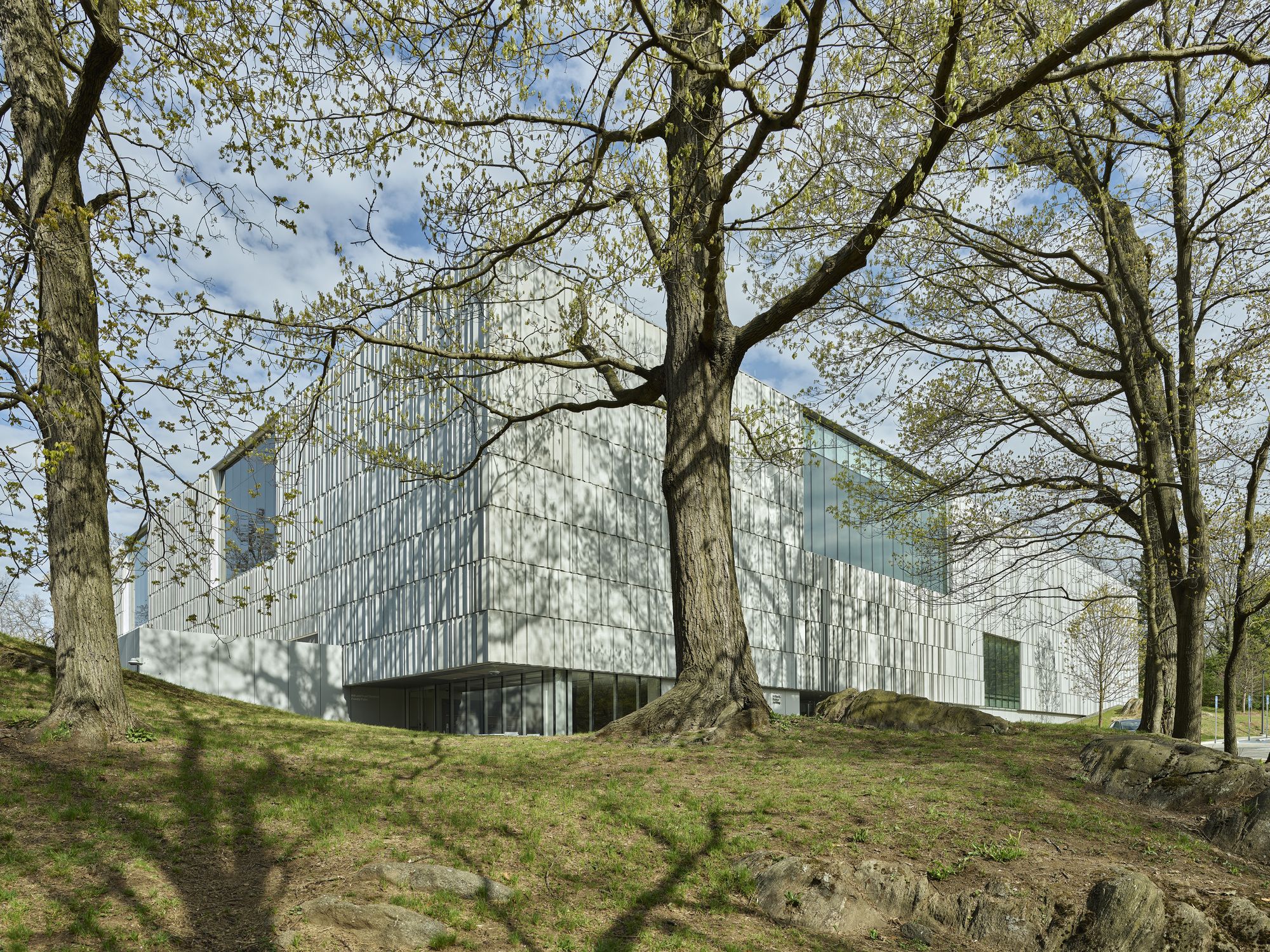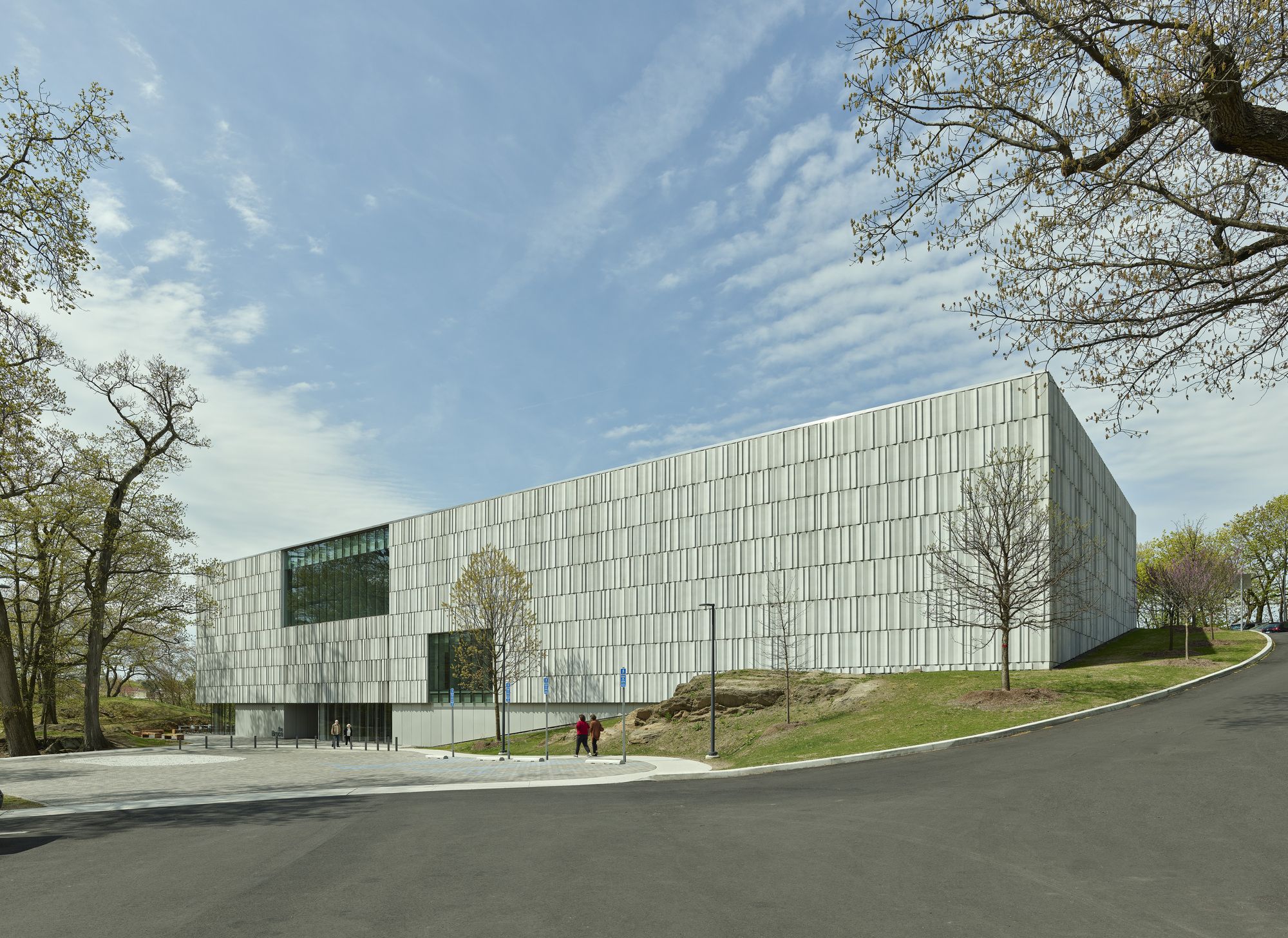 The design concept relied heavily on natural daylighting. The interior areas are filled with light from the façade‘s openings, which progressively lessen in intensity as one enters the collection galleries. The design team used the site’s distinctive geology and the surrounding area as inspiration to create a finely striated façade made of cast stone and glass that was modeled after stone quarries along the Connecticut shoreline. Throughout the day and according to the season, this exterior undergoes remarkable variations in look due to the sun’s path across the façade.