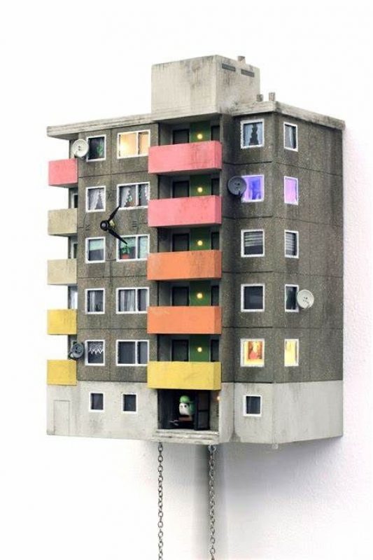 Zimmerman fuses social housing with the traditional Germany Cuckoo Clock, creating the Cuckoo Block. The Block-shaped clocks portray the simple elegance of post-war city homes. Zimmerman combines the past and present in his clocks by utilizing a new outer cover while maintaining the old soul and craftsmanship. “I think that the beautiful examples of Brutalism will never lose their spirit,” says Guido. “But while Glenkerry House by Ernő Goldfinger once offered accommodation for average citizens, for example, now it offers “hip” and hardly-affordable living.”