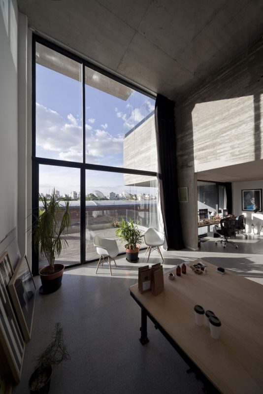 The smaller units in the front of the building are separated to generate the space that is occupied by the larger units. As a result, these larger units have a combination of single and double heights and an outdoor terrace as a continuation of the double-height sector. These units can be used as residences –with a bedroom in the single-height sector and a living/dining room in the double height- or as offices. Large and small units can also be combined to generate more complex apartments where living and work can coexist in multiple ways.