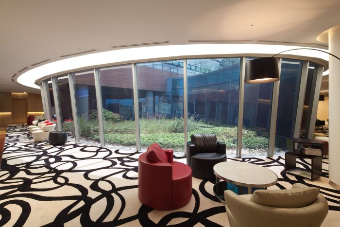 The lower floor’s outdoor transition zone of the new building keeps the overall sense of unity with the shape and image connected with the main building. For the new lobby, a drop-off zone with enough length for convenient loading has been designed, and a curved form is planned to form a connection to the main building’s lobby.