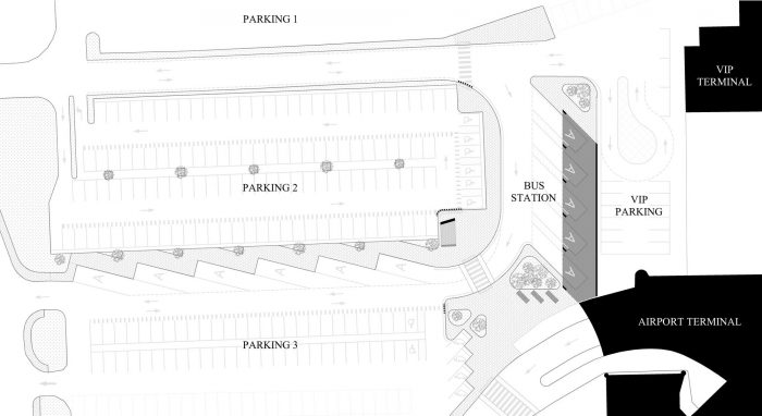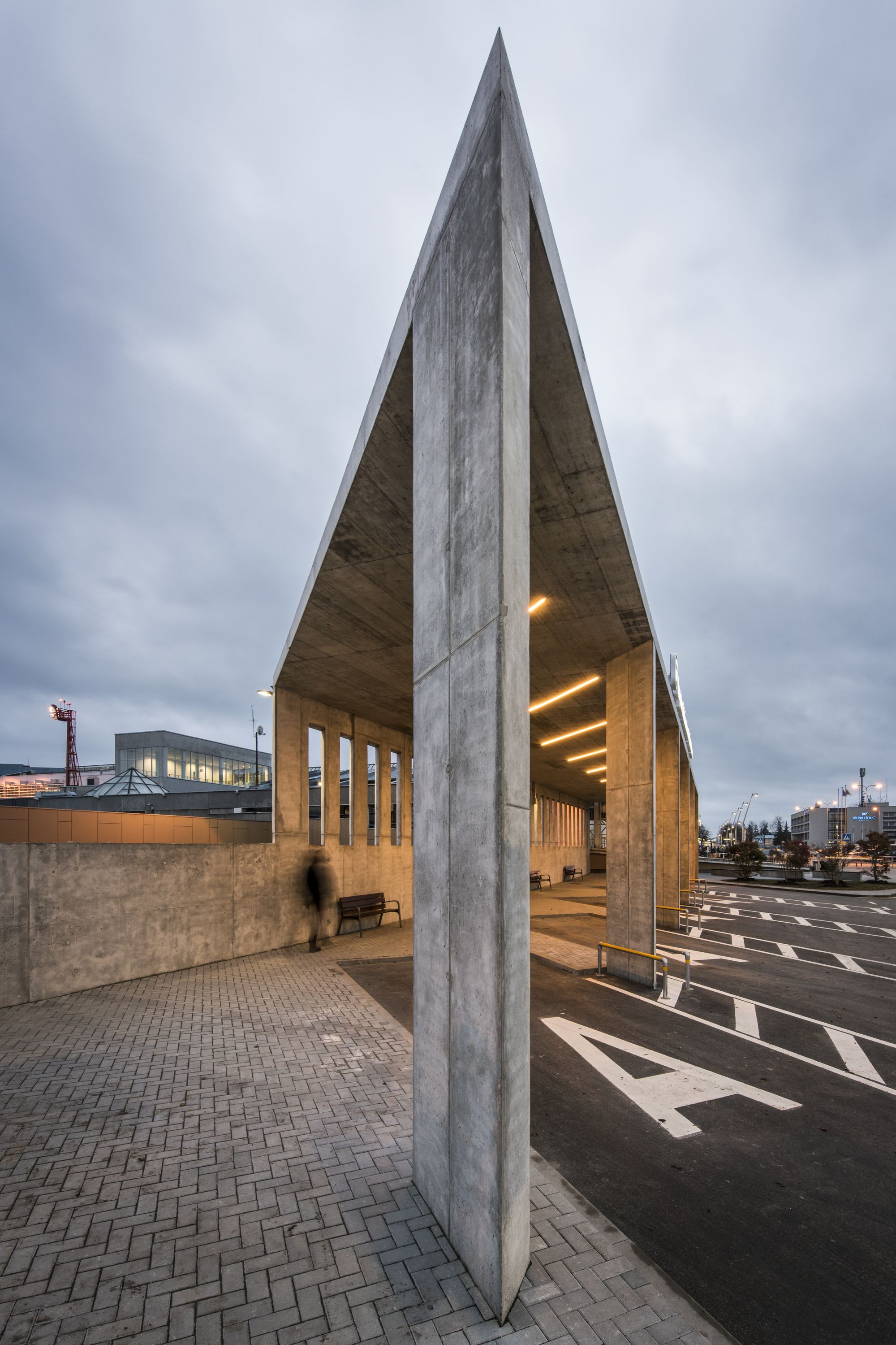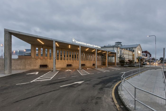 The place for the new bus stop was chosen according to the customer approved site transport scheme, so the bus stop shed ended up situated on the left side wing of the terminal building and one end of it appears to be almost attached to the car ramp. In order to avoid domination or false striving to adapt to existing different architecture terminal buildings, minimalistic form and neutral raw concrete material were chosen.