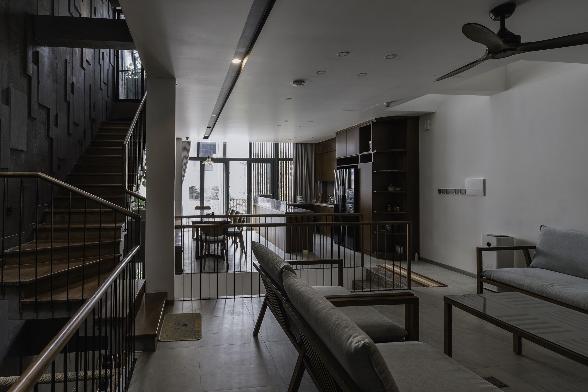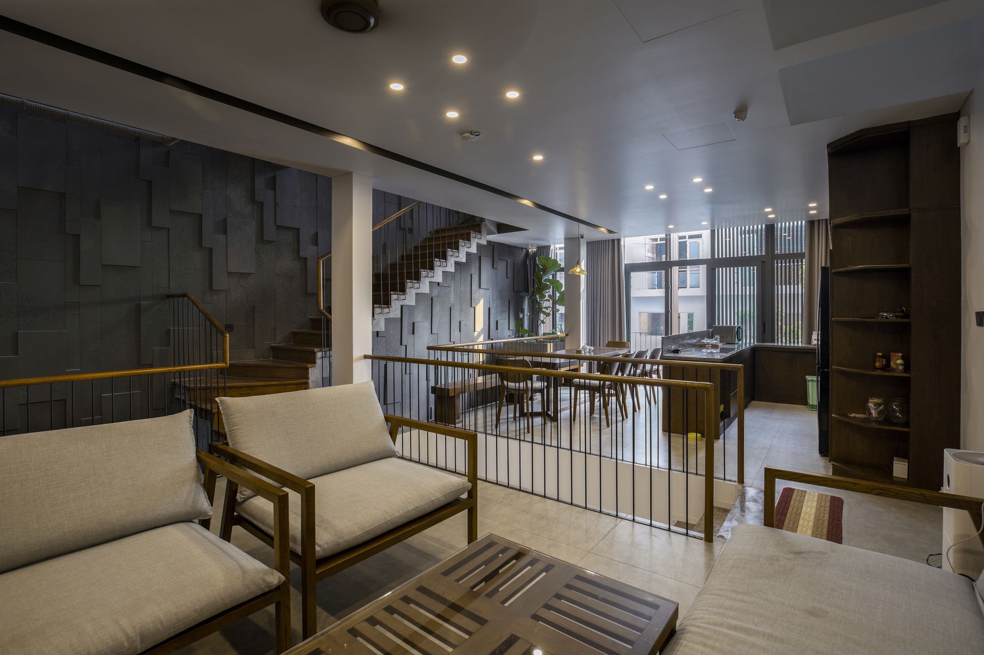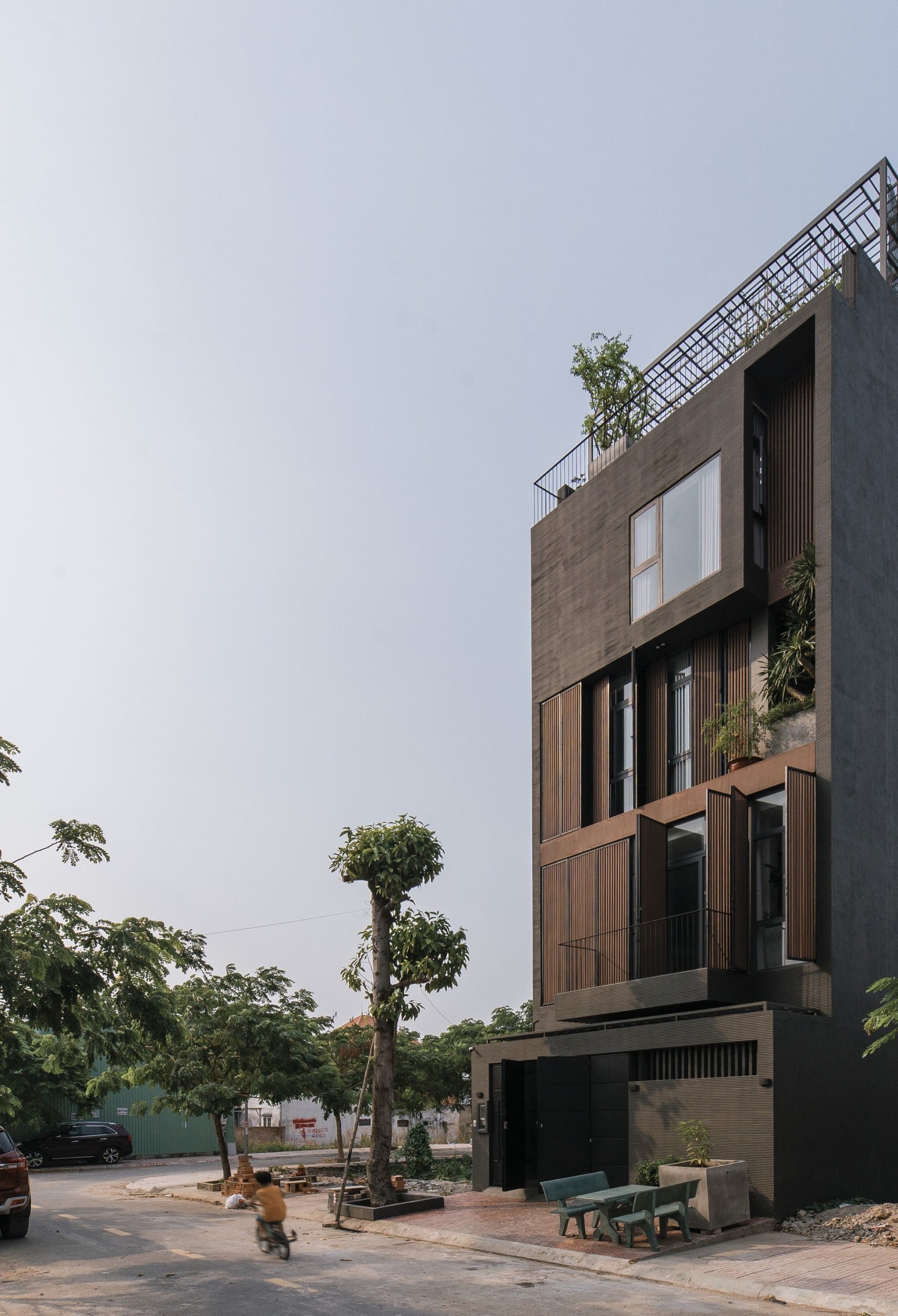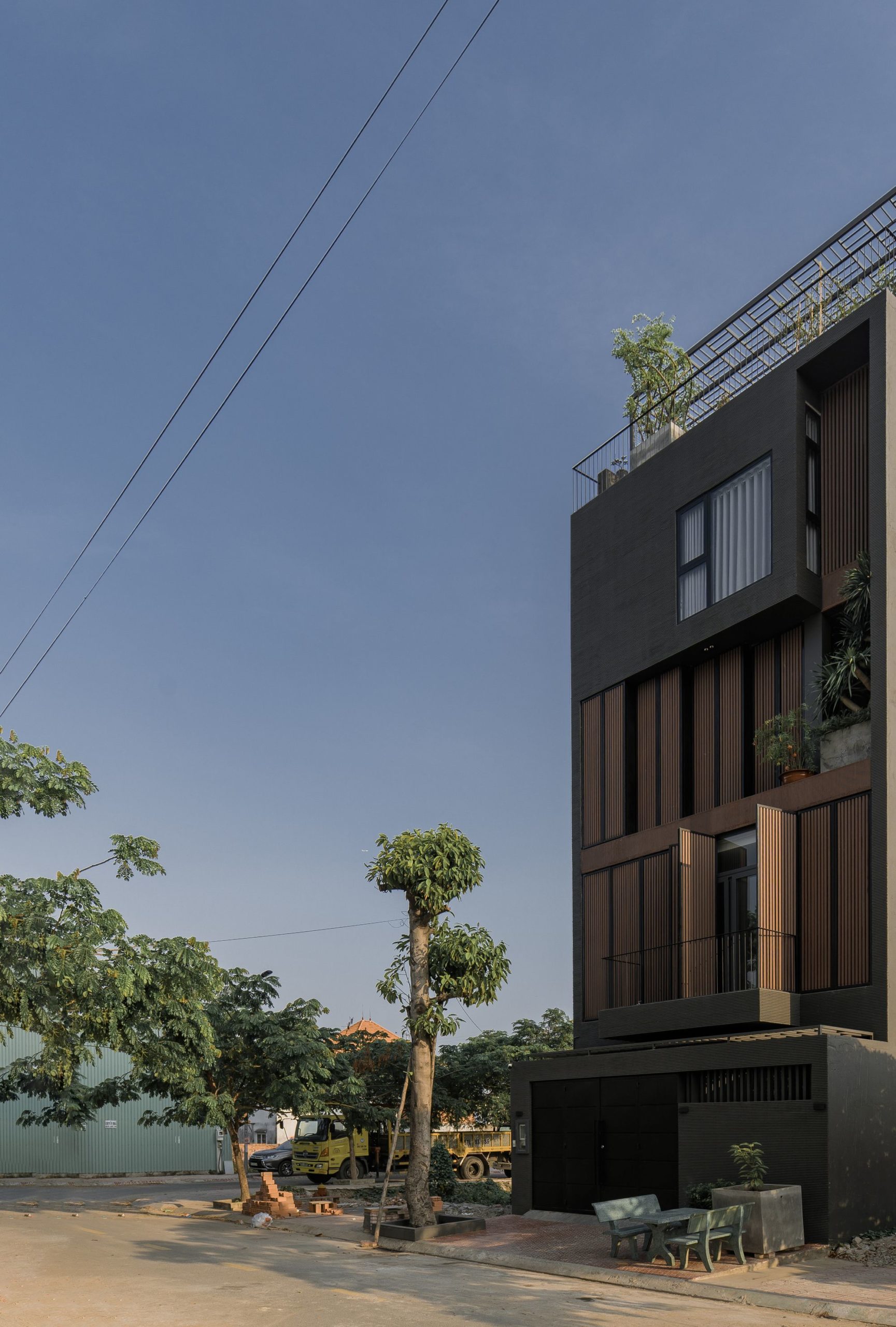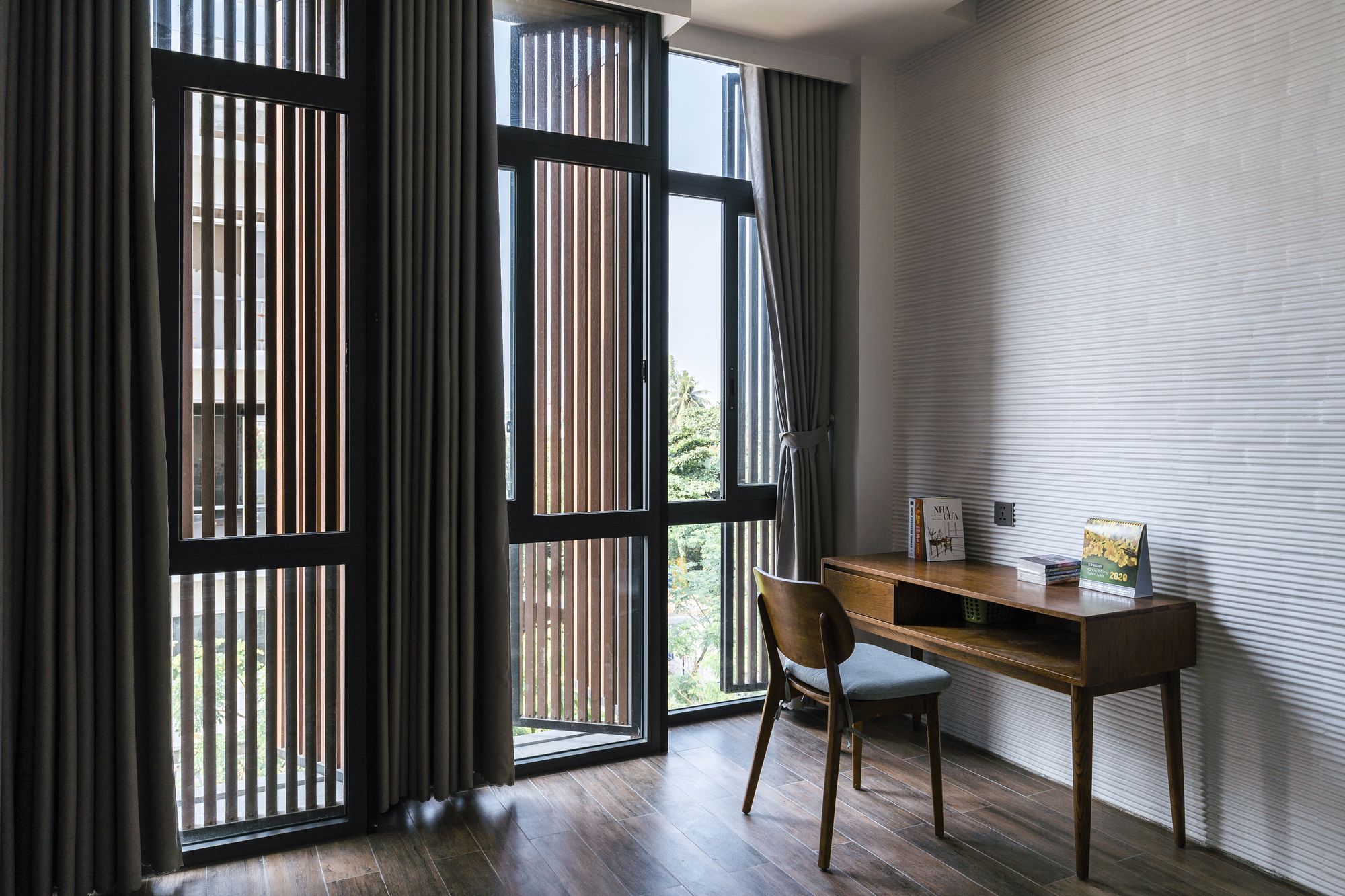 Because the house is oriented Southwest, the architect chooses solution to create a wooden sun louvre system throughout the front elevation to prevent effects from sunlight while still being able to open the ceiling glass doors to maximize the interaction between the space inside and outside.